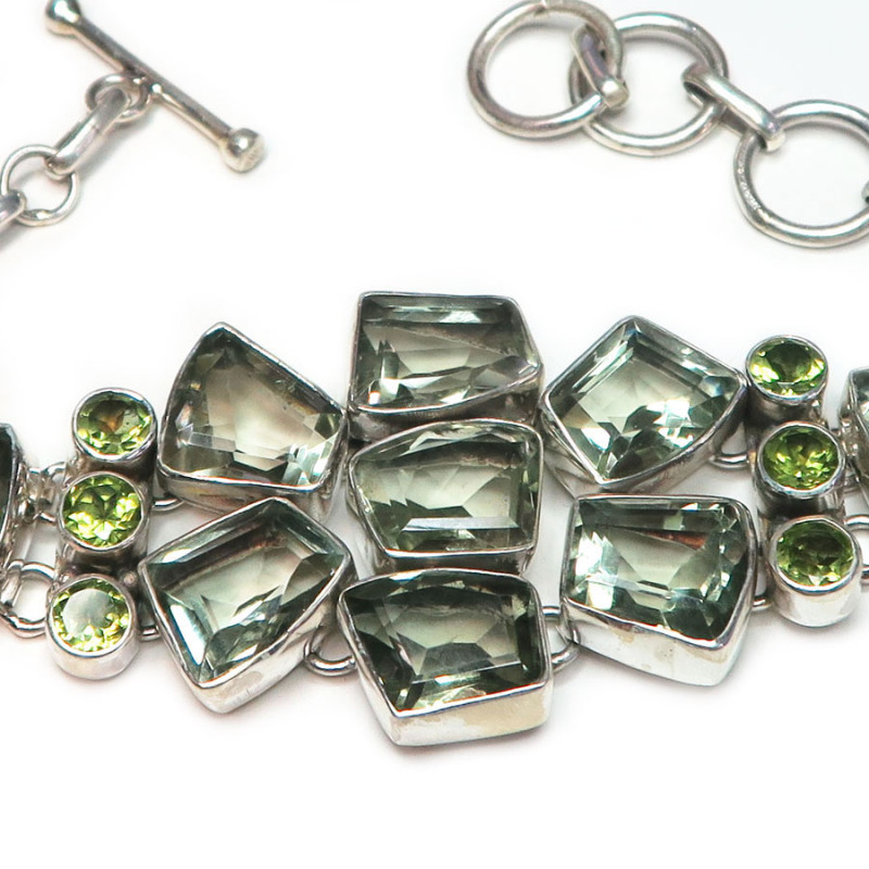 Браслет с зеленым аметистом (празиолитом) и мелким хризолитом, камни с огранкой высокого качества. Длина браслета регулируется кольцами, максимальная длина браслета 22 см. Ширина браслета в центре - 3.5 см. Металл - серебро. Вес браслета - 35.14-35.62 гр. Производство Индия. Заказать в интернет магазине с доставкой.