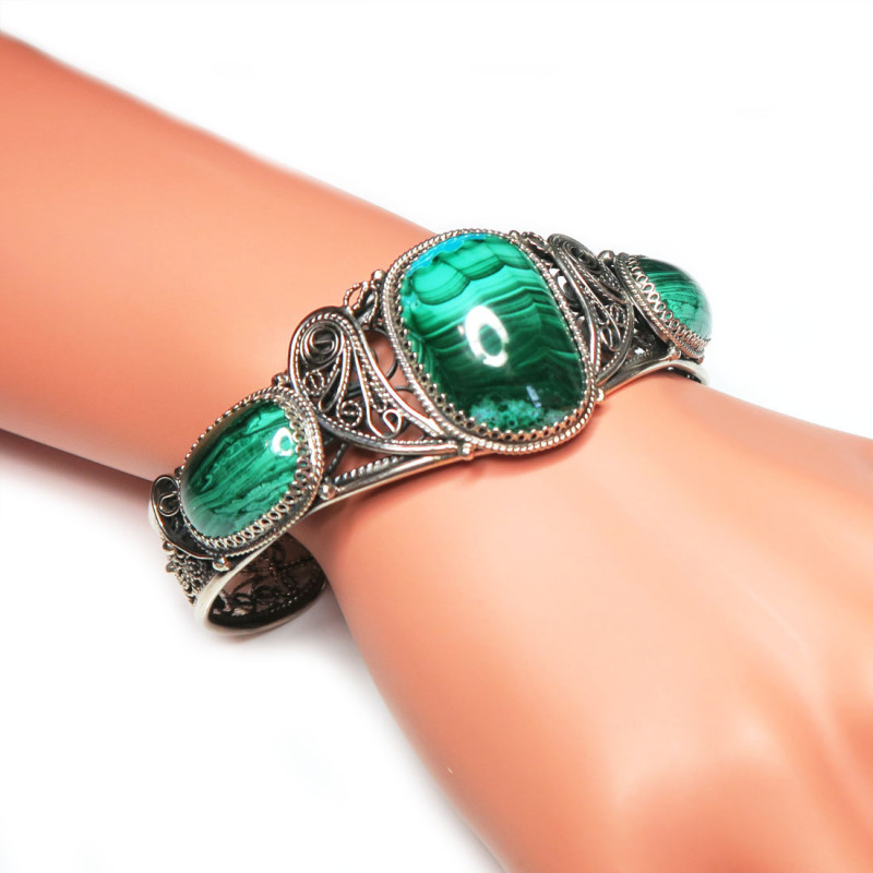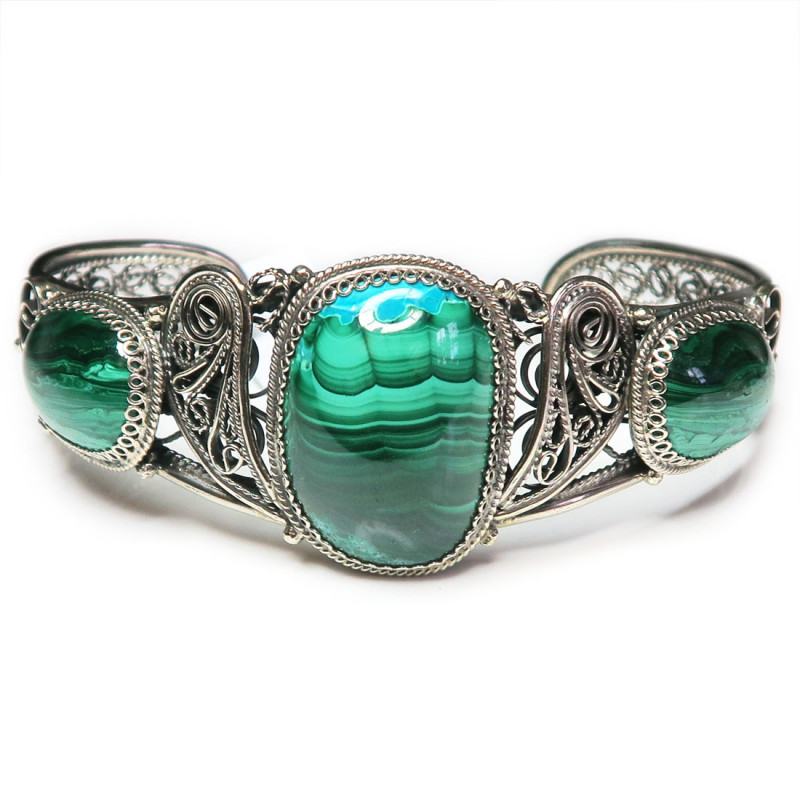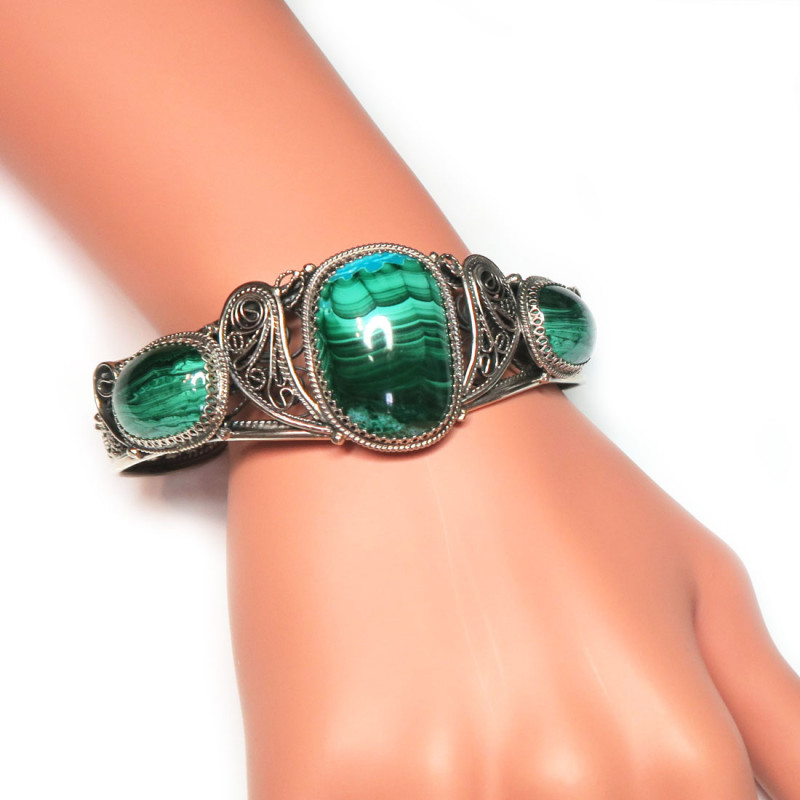 Браслет с малахитом и включением хризоколлы. Ширина браслета в центральной части - 3 см. Размер центрального камня: 2*2.7 см. Металл - нейзильбер. Производство - Екатеринбург. Приобрести в интернет-магазине браслет с малахитом и хризоколлой.