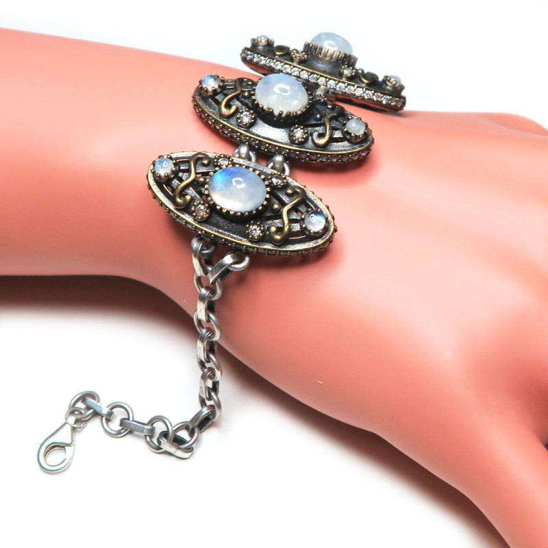 Браслет с лунным камнем. Камни без огранки. Длина браслета регулируется кольцами, максимальная длина браслета - 22 см. Размер звена браслета: 3.3*1.5 см. Металл - серебро с чернением и позолотой. Вес браслета - 25.5 гр. Производство - Индия. Приобрести в интернет-магазине.