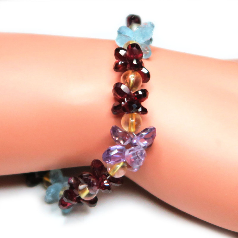 Браслет с гранатом, аметистом, голубым топазом, цитрином, камни с огранкой и без огранки, длина браслета 21 см, вес 21.7 гр., ширина 1.1 см, замок - карабин серебряный.
