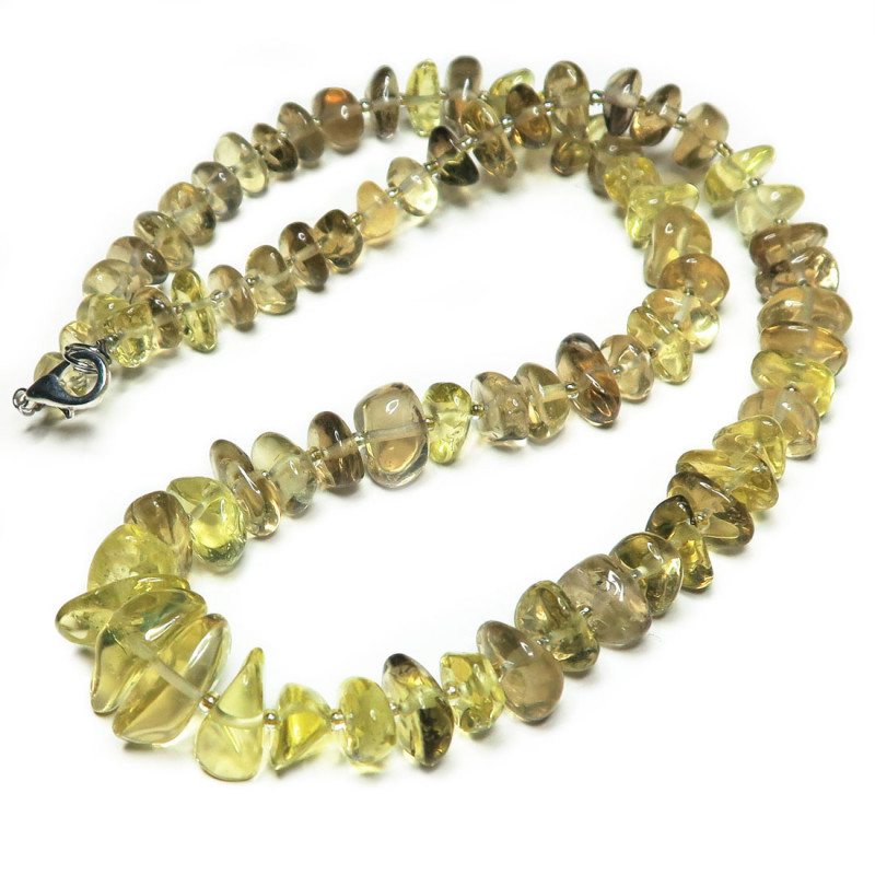 Бусы из цитрина лимонного цвета, некоторые камни с включениями раухтопаза, обработка камня - галтовка. Камни разного размера и формы. Длина бус 51.5 см., размер более крупных камней 1.8*0.6 см. Замок карабин серебристого цвета. Производство Россия.