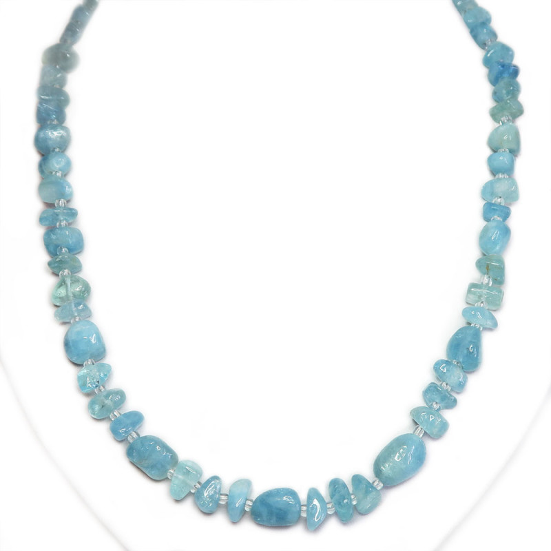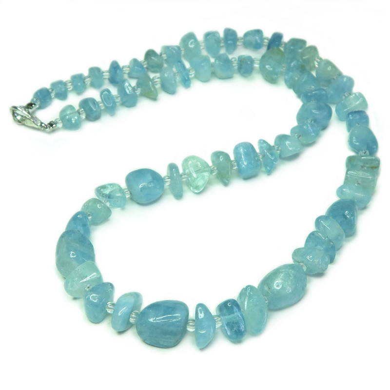 Бусы из аквамарина голубого цвета, камни разной формы и размера, длина бус 50-51 см., размер камня увеличивается к центру бус, замок карабин серебристого цвета. Производство Россия.
