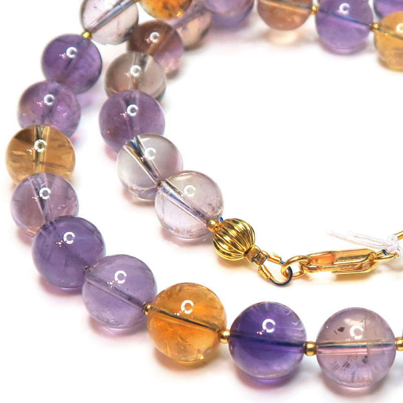 Бусы из аметрина, камни без огранки, форма шарик, размер камня 1.1-1.2 см., длина бус 51.5 см., вес бус 63.83-64.41 гр., замочек карабин и бусины - золотистого цвета.