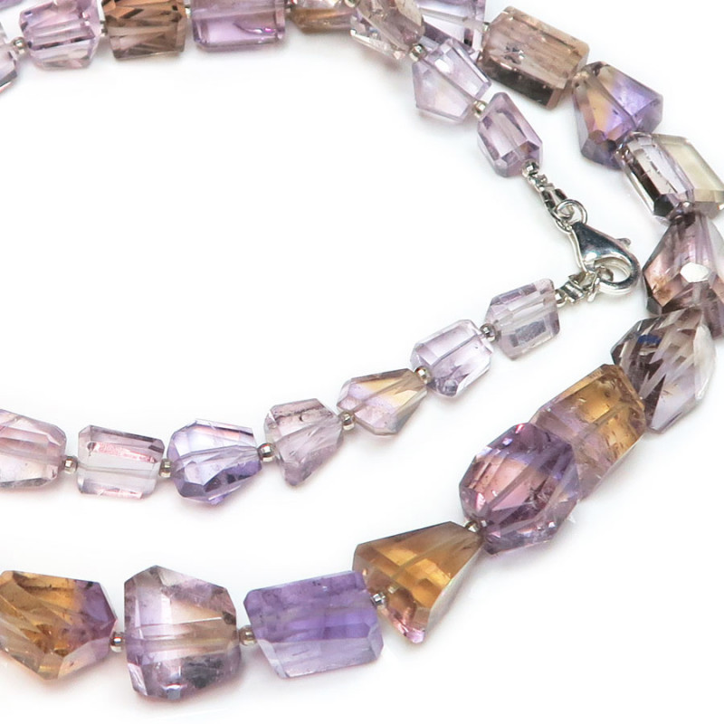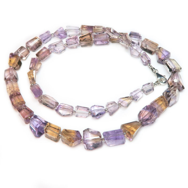 Бусы из аметрина, камни с огранкой не правильной формы, размер камня увеличивается к центру бус размер камня от 0.8 до 1.5 см., вес бус 53.55 гр., длина бус 56 см., граненые бусинки между камнями и замочек карабин серебряные.