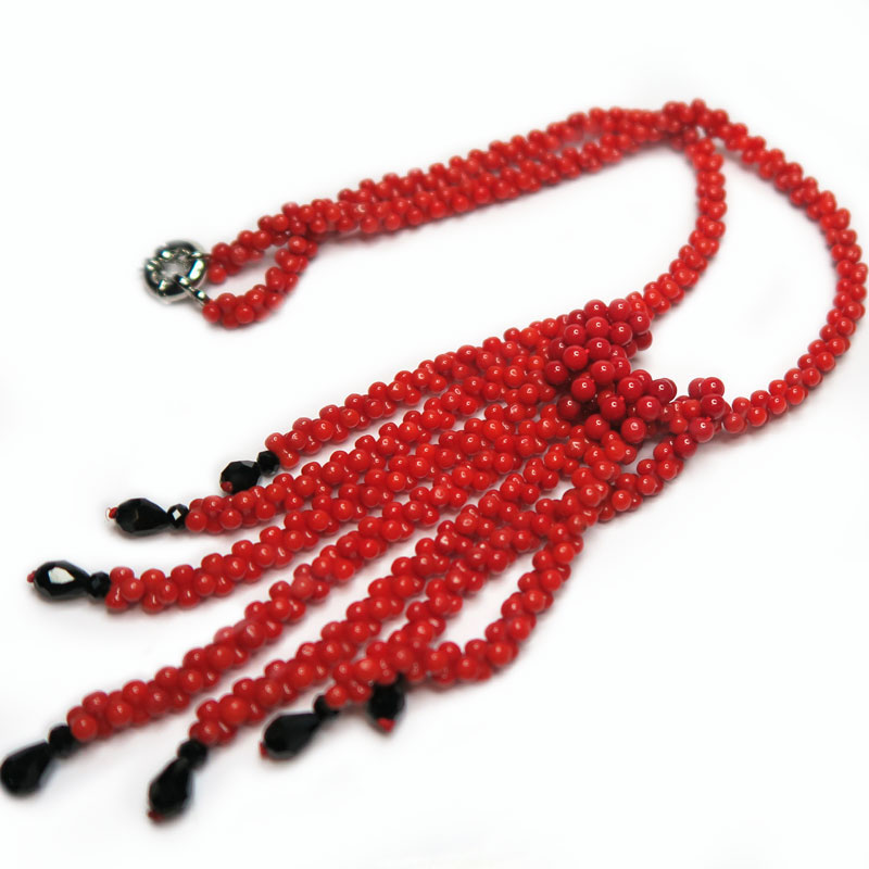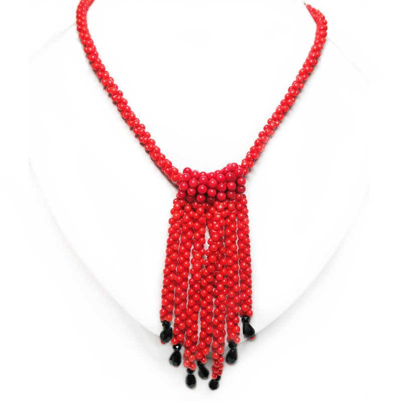 Бусы из красно-оранжевых кораллов, длина бус 45 см., внизу бусины из граненого черного стекла.