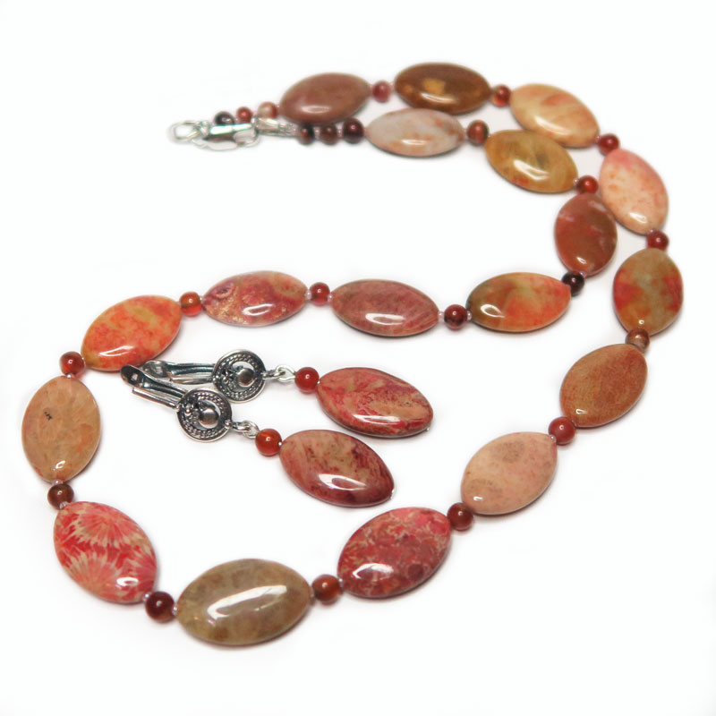 Бусы и серьги из окаменелого коралла и мелкого сердолика. Длина бус - 50.5 см. Размер камня: 2*1.3 см. Длина серег - 2.5 см (без учета замка), в серьгах - английский замок. Металл - ювелирный сплав. Бусы - 1500 руб., серьги - 800 руб.