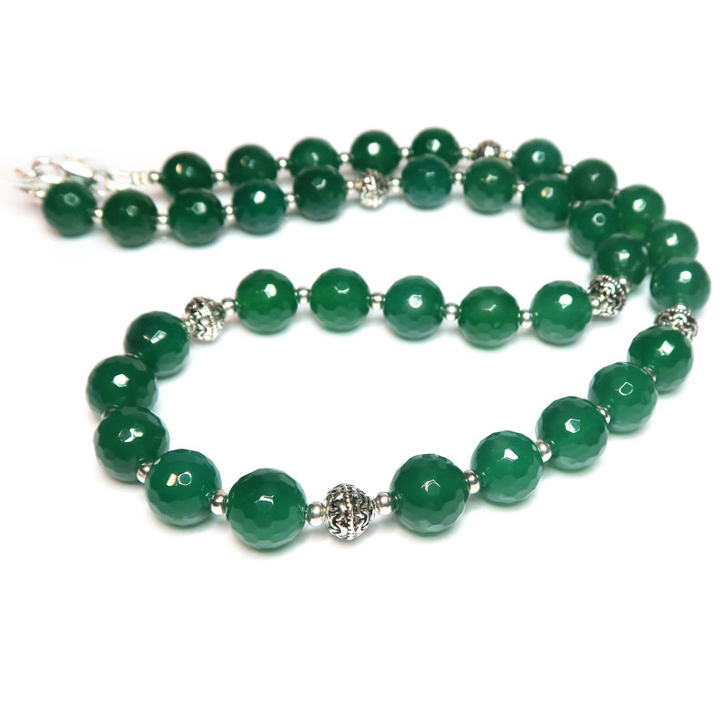 Бусы из зеленого оникса, камни с огранкой красивого цвета, размер камня 1 см., длина бус 51 см., вставки серебристые бусины с чернением, замочек карабин.