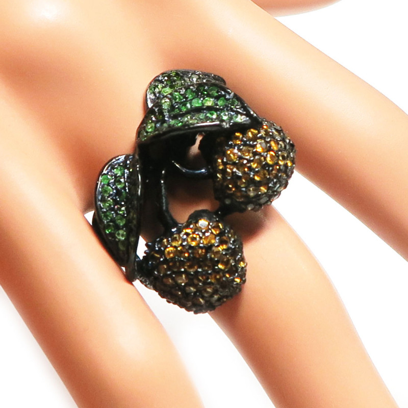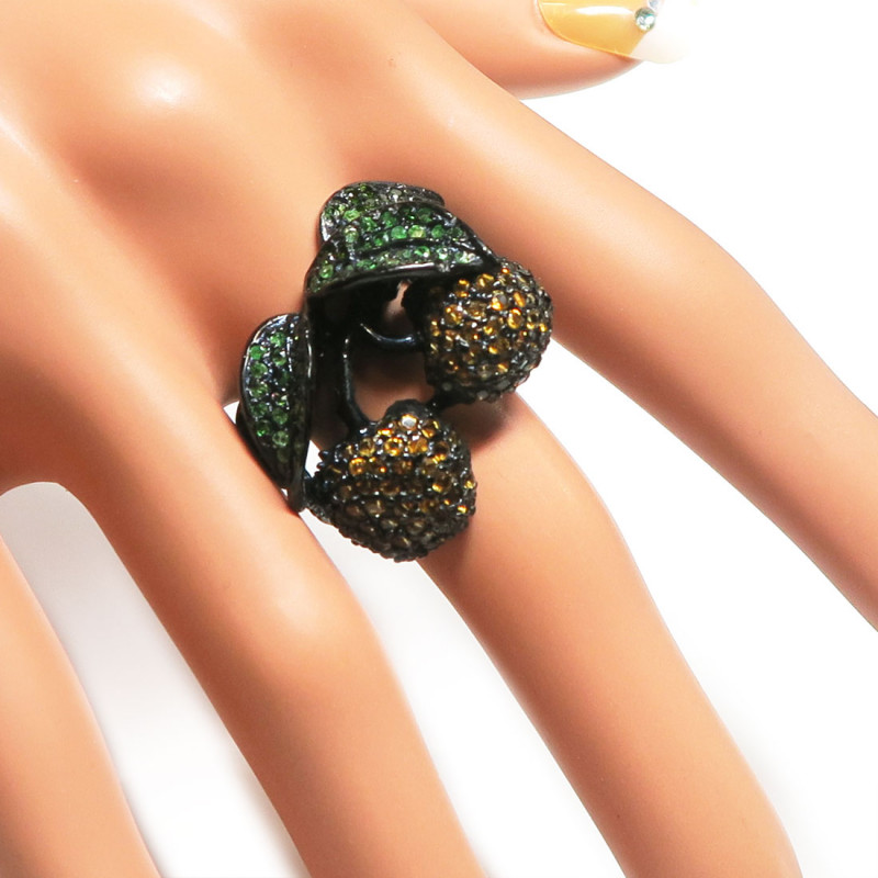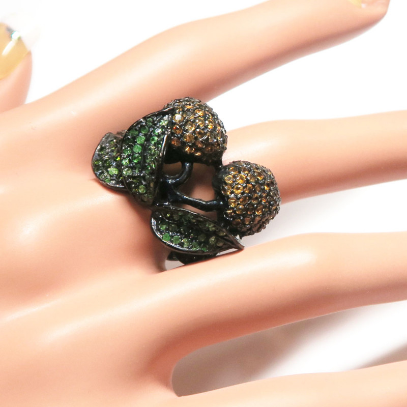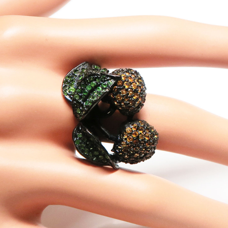 Кольцо с цитрином и хромдиопсидом, размер кольца 18.5, размер изделия 2*2.6 см., вес изделия 11.94 гр., металл серебро с покрытием черном родием, производство Камбоджа.