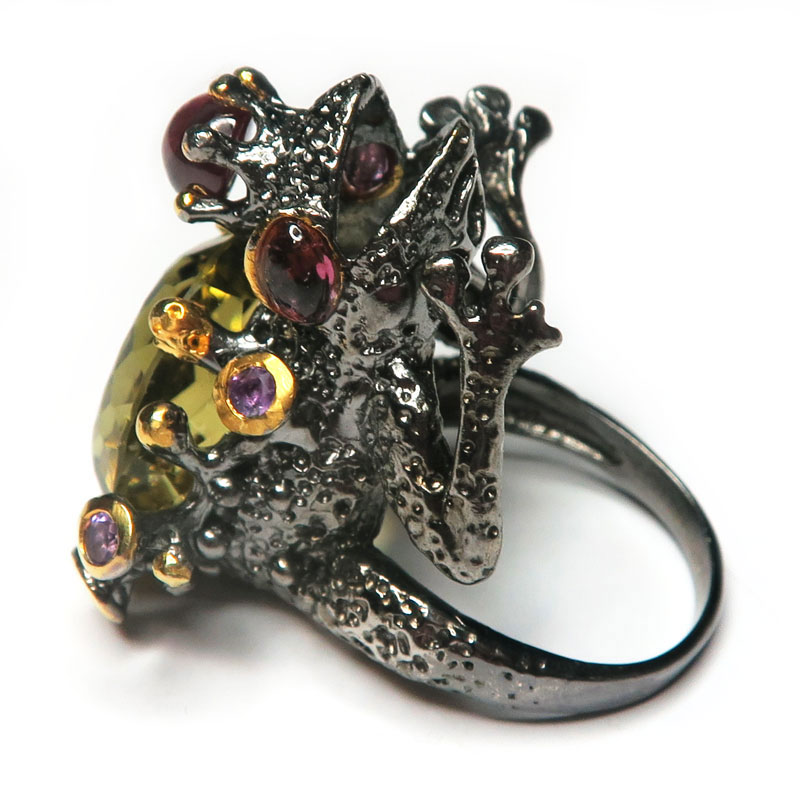 Кольцо с цитрином, розовым турмалином, аметистами, камни с огранкой и без огранки, размер кольца 18.5, размер камня в кольце 1.8*1.5 см., размер изделия 2*3 см., металл серебро с покрытием черным родием и позолотой, вес кольца 14.9 гр., производство Таиланд.