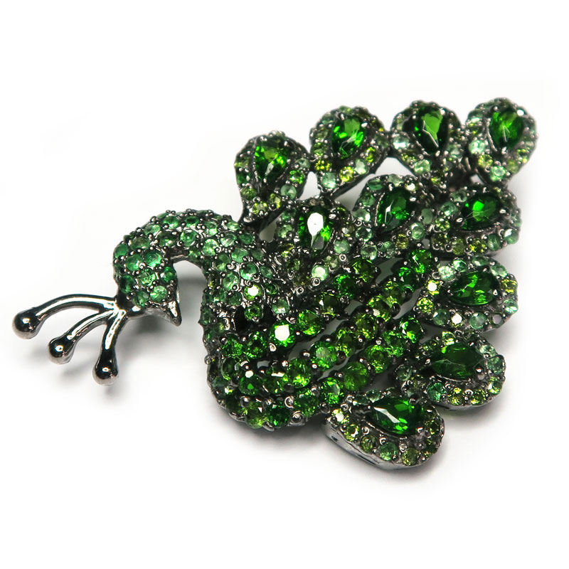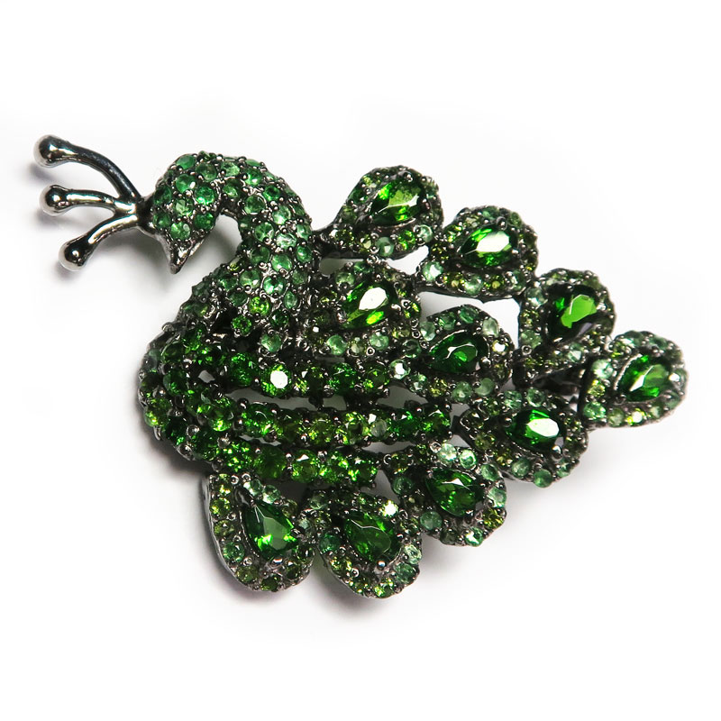 Брошь Лебедь с хромдиопсидом, камни с огранкой, размер изделия 4.5*4 см., вес кулона-броши 14.5 гр., металл серебро с покрытием черным родием, производство Камбоджа.