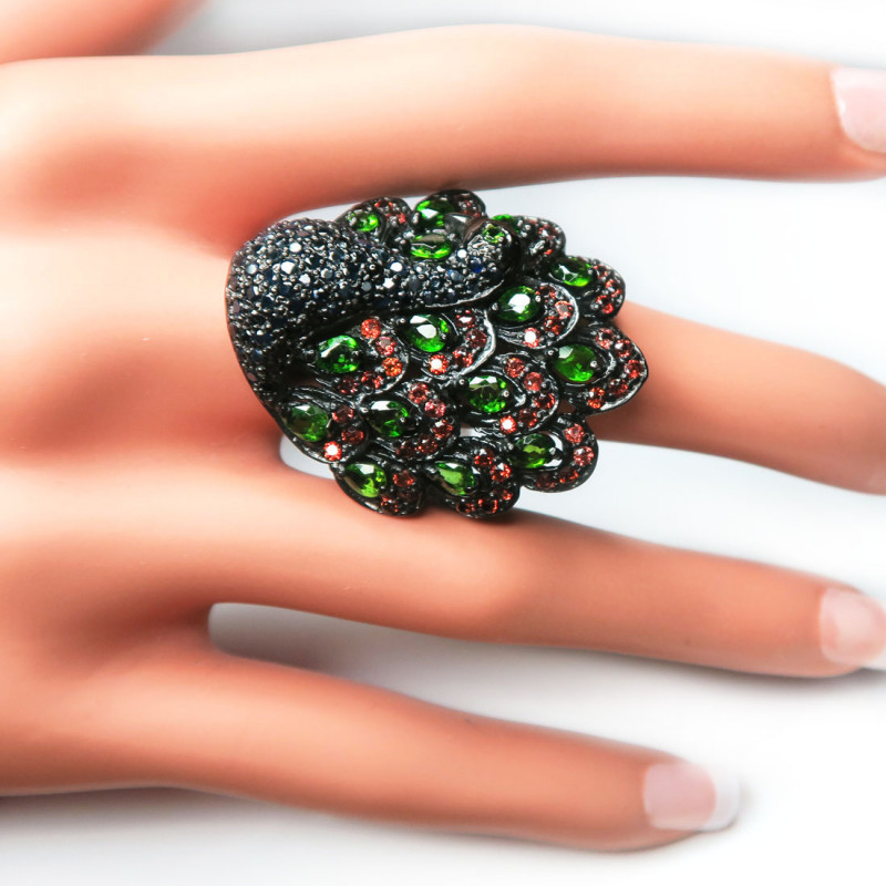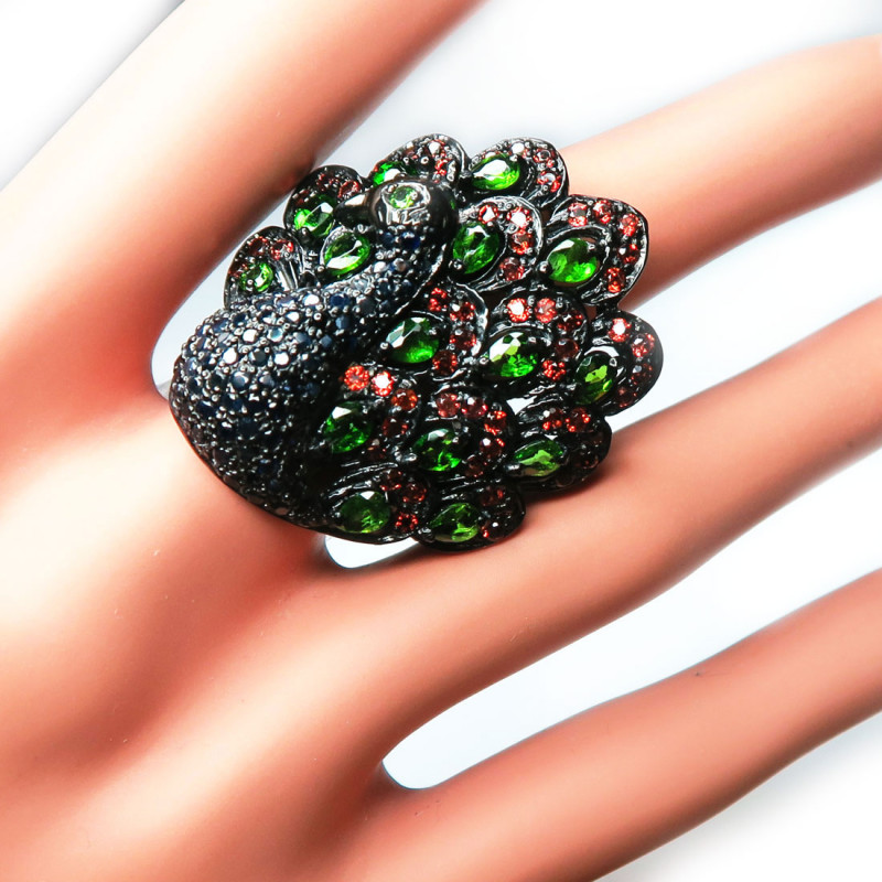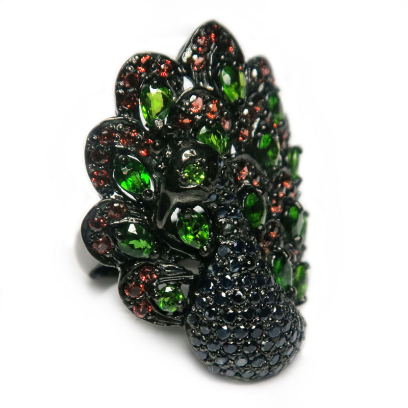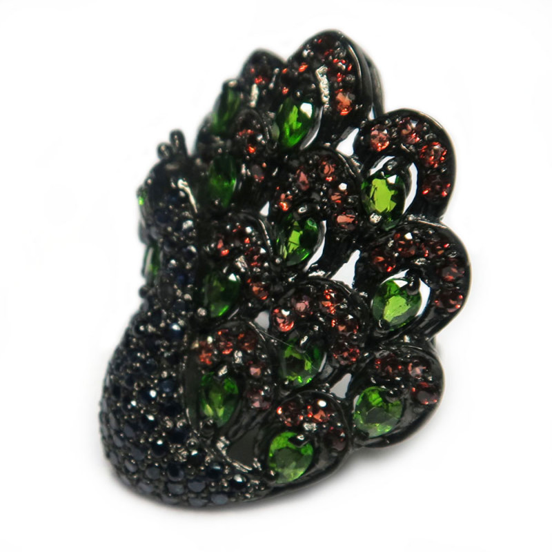 Кольцо Павлин с хромдиопсидом, сапфиром, гранатом, размер кольца 19.5, размер изделия 3.5*2.5 см., камни с огранкой, вес изделия 16.18 гр., серебро с покрытием черным родием, производство Камбоджа.