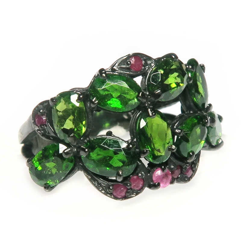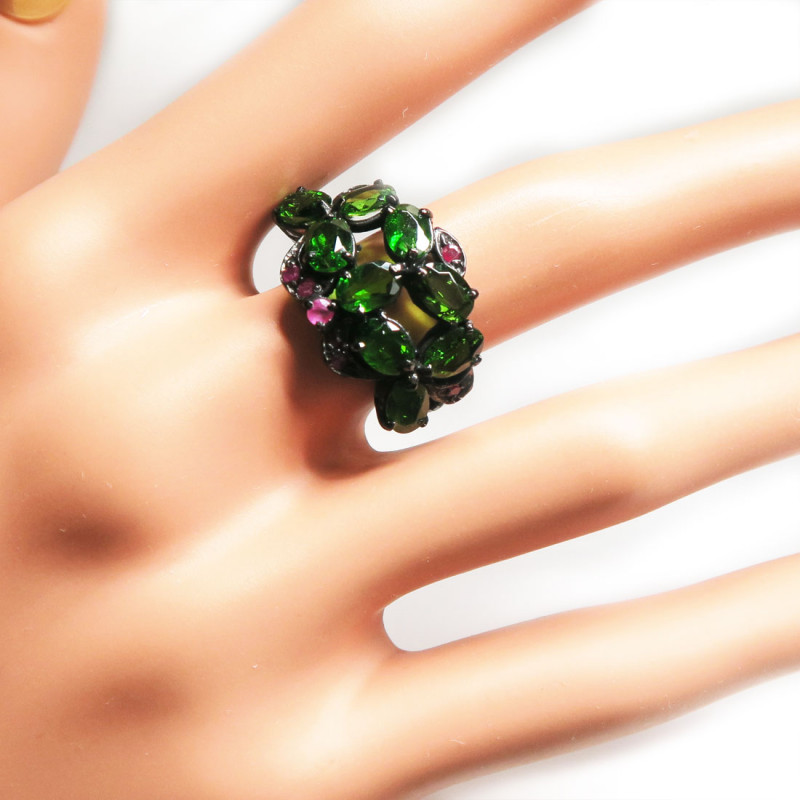 Комплект с хромдиопсидом, рубином, камни с огранкой, размер кольца 18.75, размер изделия в кольце 1.5*3, размер серьги 3*1.5 см., вес комплекта 16.1 гр., в серьгах итальянский замок, металл серебро с покрытием черным родием, производство Камбоджа.