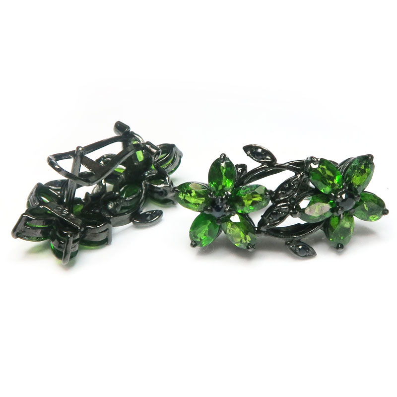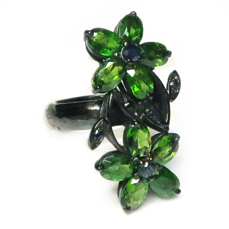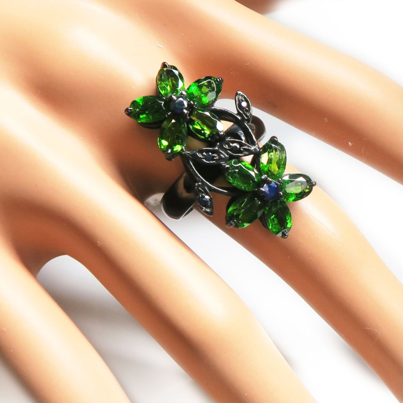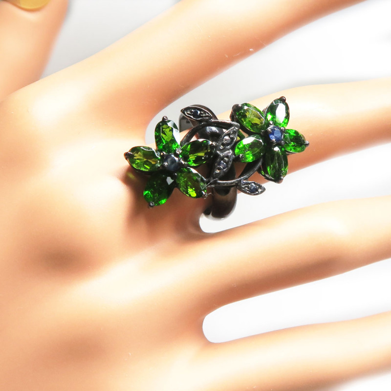 Комплект с хромдиопсидом, сапфиром, камни с огранкой, размер кольца 18, размер изделия в кольце 1.5*3.4, размер серьги 3.4*1.5 см., вес комплекта 19.8 гр., в серьгах итальянский замок, металл серебро с покрытием черным родием, производство Камбоджа.