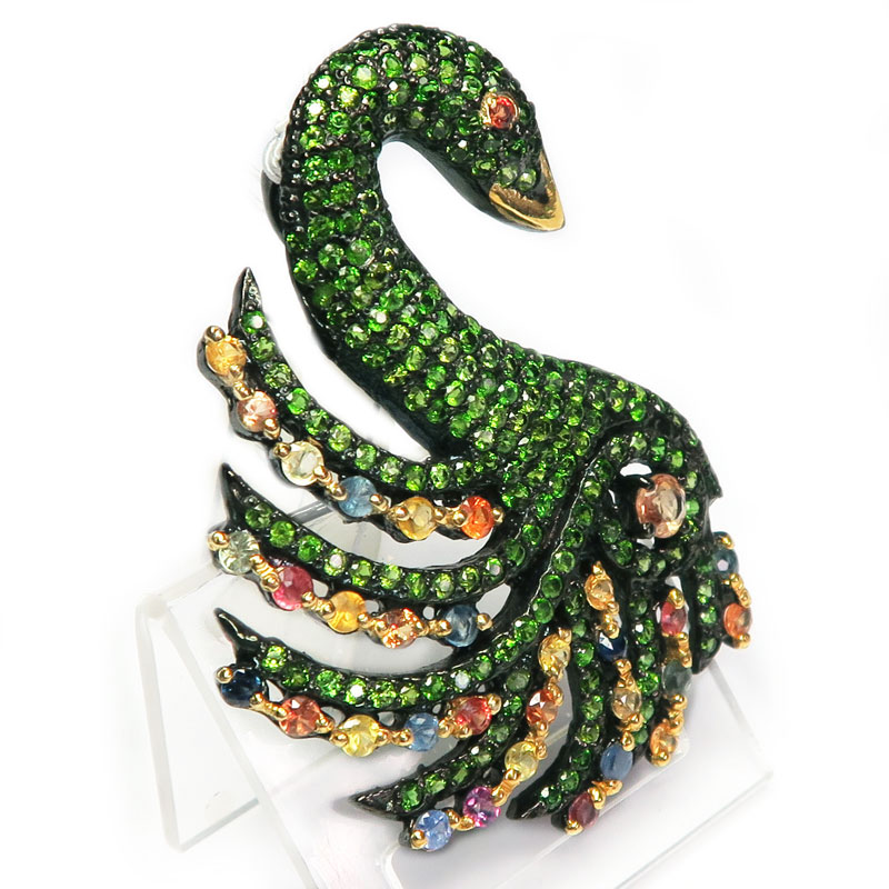 Кулон-брошь с хромдиопсидом и цветными сапфирами, размер изделия 5*3.5 см., вес кулона-броши 12.4 гр., металл серебро с покрытием черным родием, производство Камбоджа.