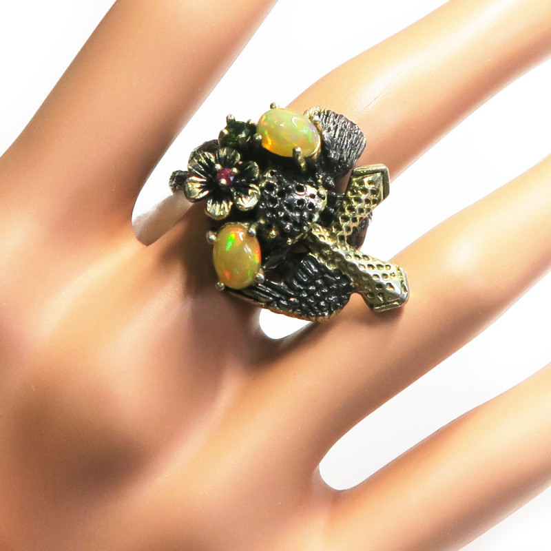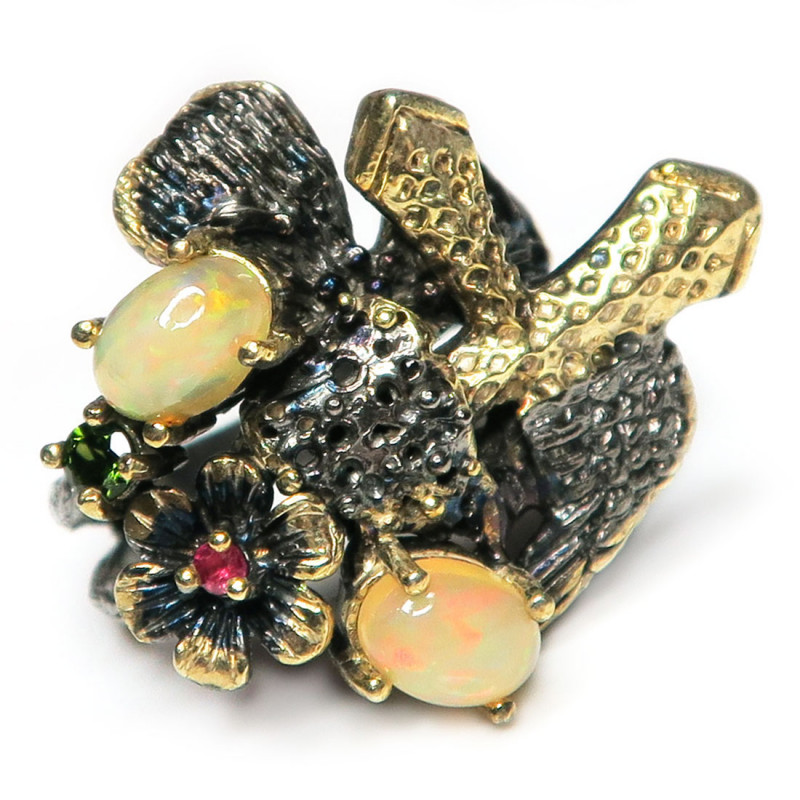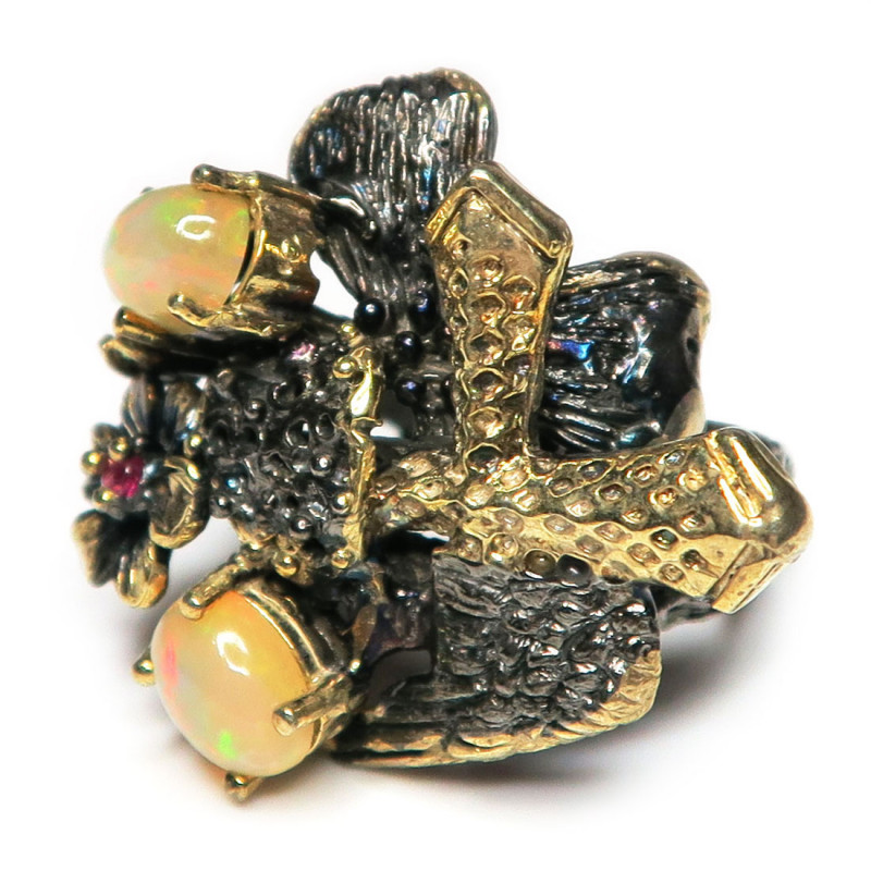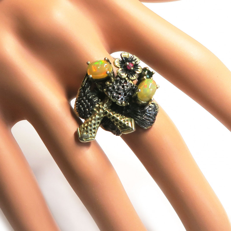 Кольцо с опалами, рубином, хромдиопсидом, опалы без огранки, размер кольца 18.25, размер изделия 2.8*3 см., металл серебро с покрытием черным родием и позолотой, вес кольца 11.13 гр., производство Таиланд.