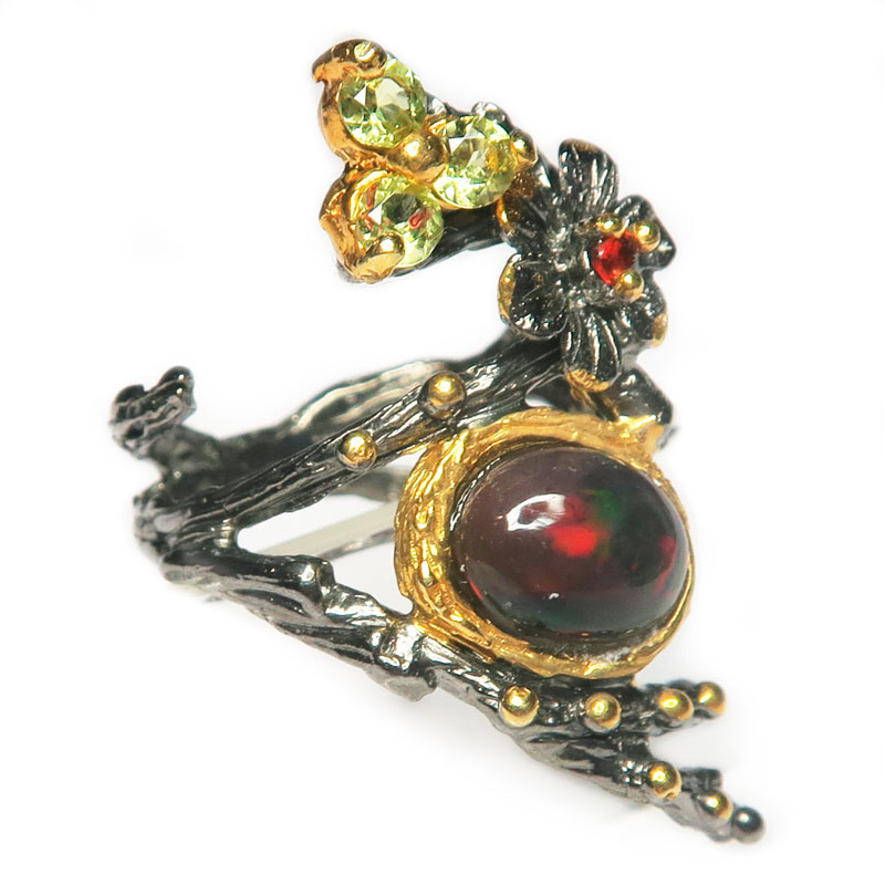 Кольцо с черным опалом без огранки, хризолитом и гранатом с огранкой, размер кольца 17.5, размер изделия 1.5*3.5 см., вес кольца 7.4 гр., размер камня 1*0.8 см., камни отличного качества, красивого цвета, металл серебро с позолотой. Производство Таиланд.