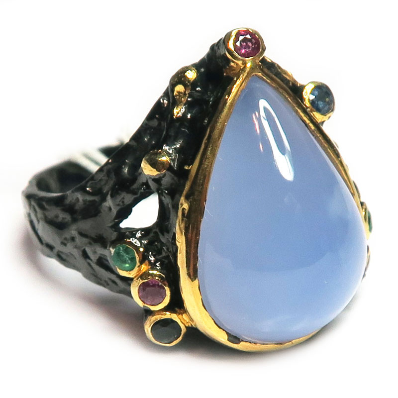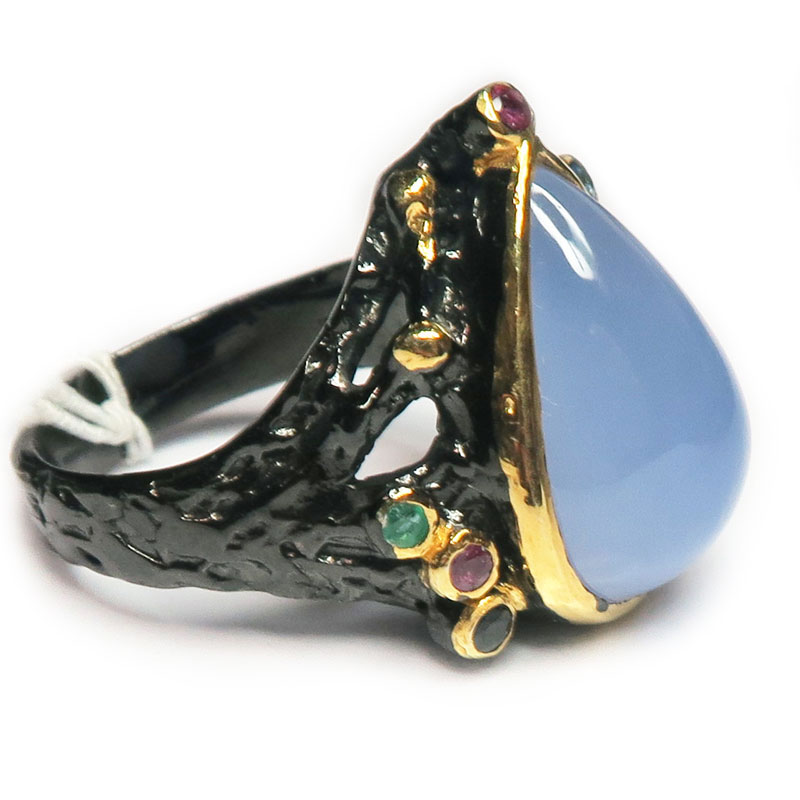 Кольцо с голубым халцедоном без огранки и мелкими рубинами, сапфирами, бериллом с огранкой, размер кольца 19, размер камня в кольце 1.8*1.3 см., вес изделия 12.5 гр., серебро с покрытием черным родием и позолотой, производство Камбоджа.