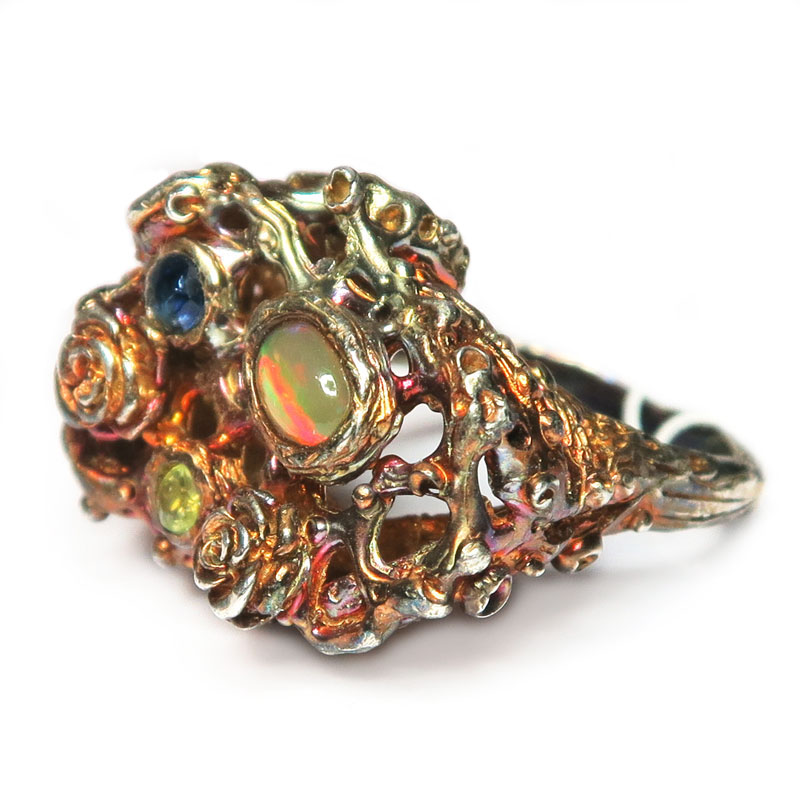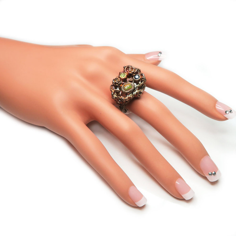 Кольцо с натуральным опалом высокого качества, сапфиром и лимонным топазом, размер кольца 18, размер изделия 2*2.5 см., хорошее качество камня, серебро с покрытием черным родием и цветной позолотой, вес кольца 11 гр., авторская работа, производство Тайланд.