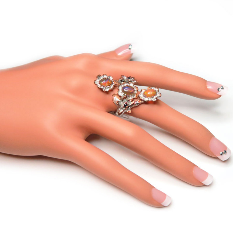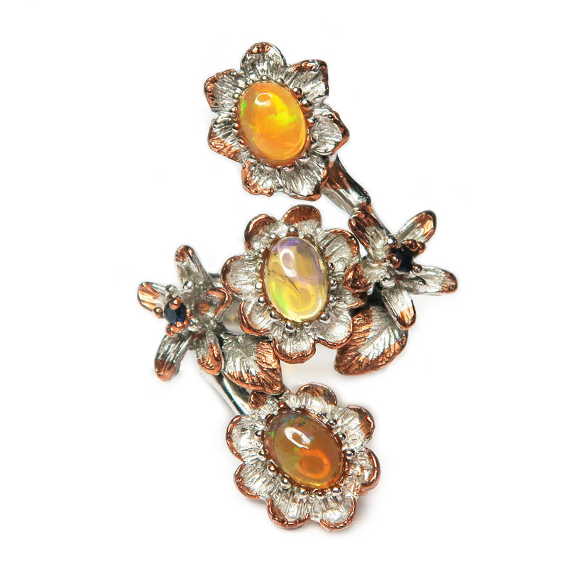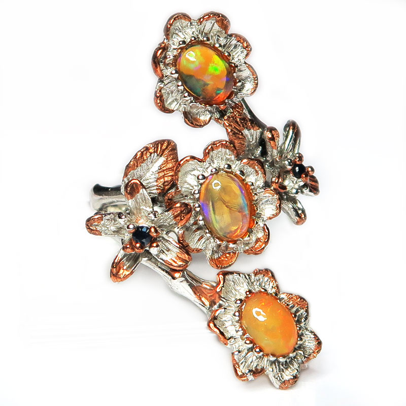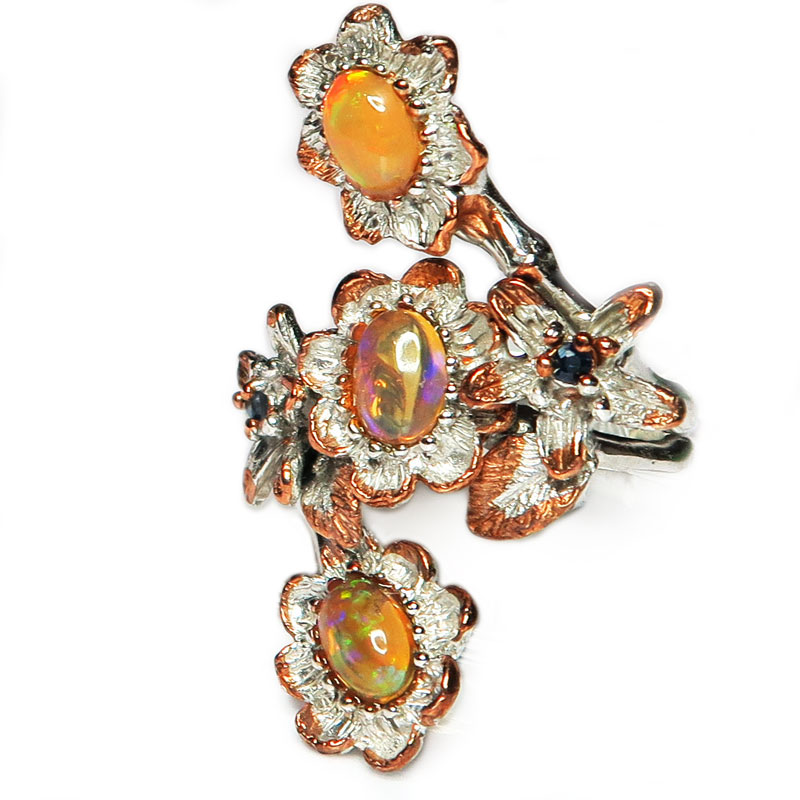 Кольцо с желтыми опалами без огранки и мелкими сапфирами с огранкой, размер кольца 17.5, размер камня 0.5*0.8 см., размер изделия 4*2.8 см., хорошее качество камня, серебро с чернением и позолотой, вес кольца 9.4 гр., авторская работа, производство Тайланд.