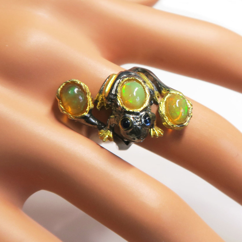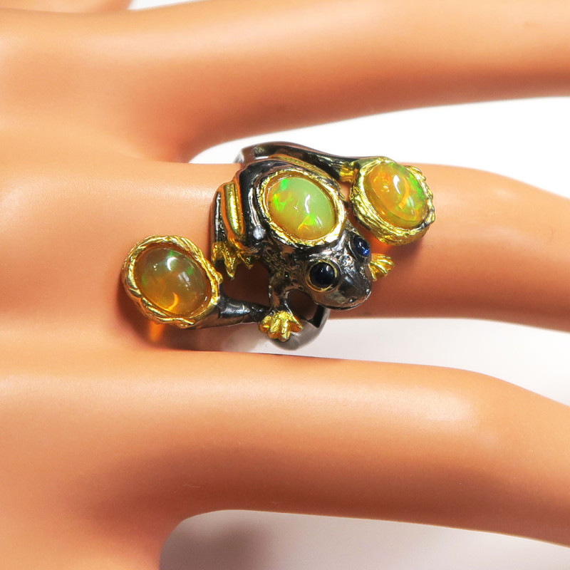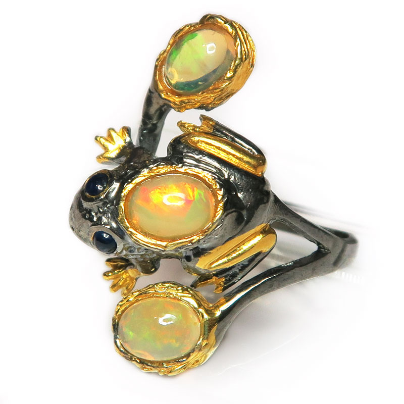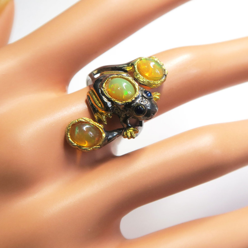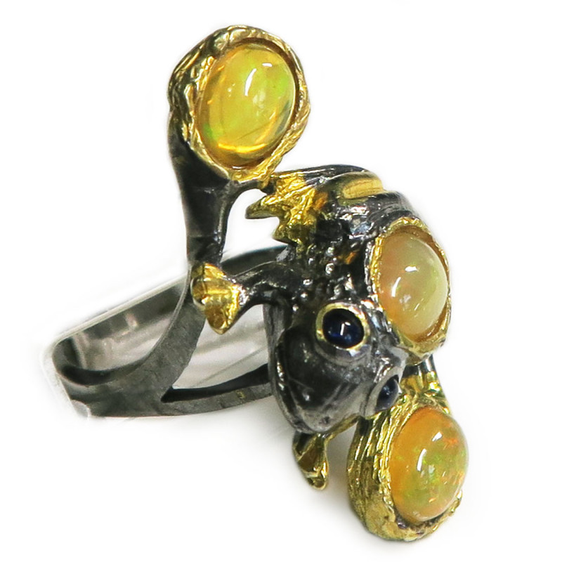 Кольцо с желтым опалом без огранки, размер кольца 17.5, размер камня 1*0.8 см., размер изделия 1.5*3 см., хорошее качество камня, серебро с чернением и позолотой, вес кольца 6.5 гр., авторская работа, производство Тайланд.