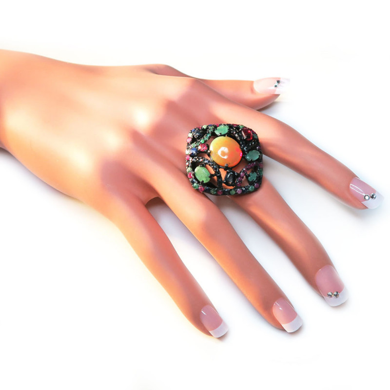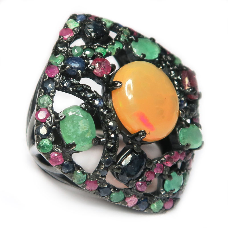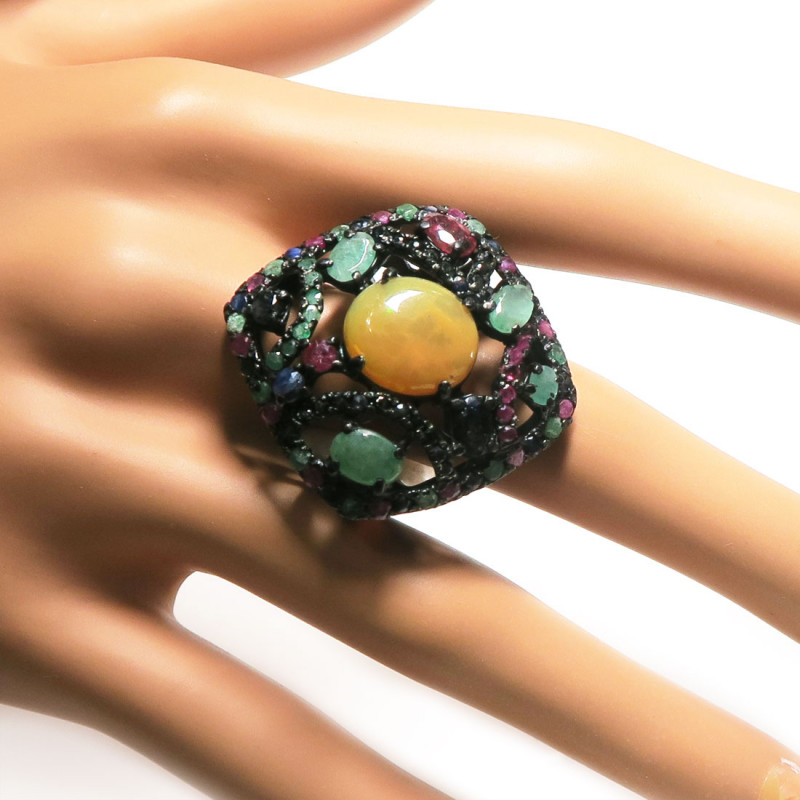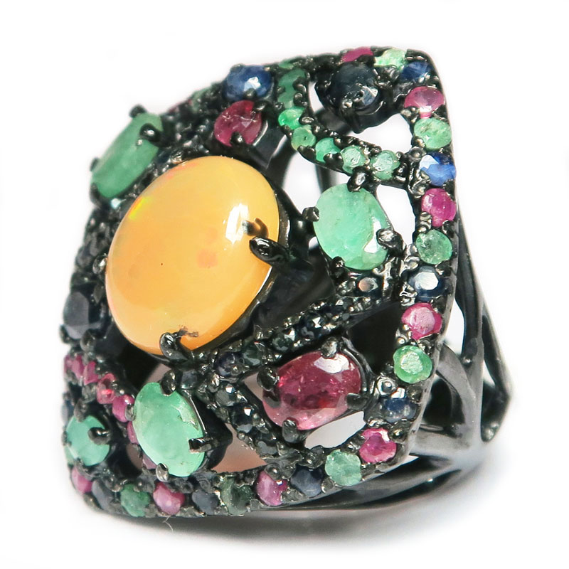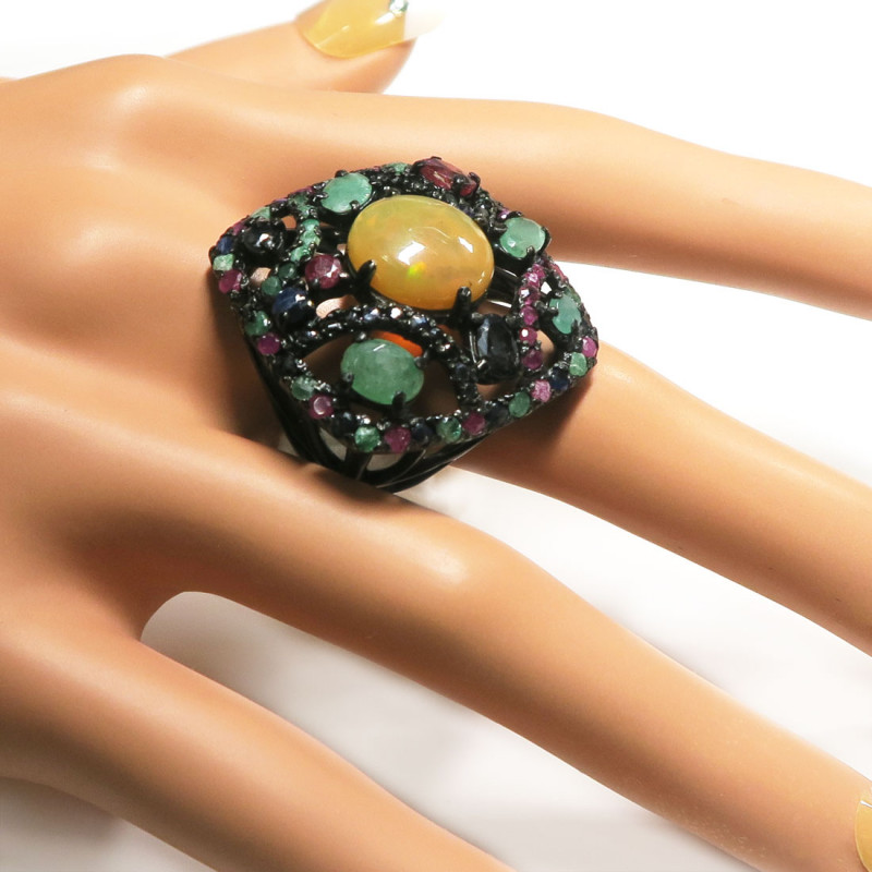 Кольцо с желтым опалом без огранки, рубином, сапфиром бериллом с огранкой, размер кольца 18.5, размер изделия 3.5*3.2 см., размер опала 1.3*1.1 см., серебро с покрытием черным родием, вес кольца 13.8 гр., производство Камбоджа.