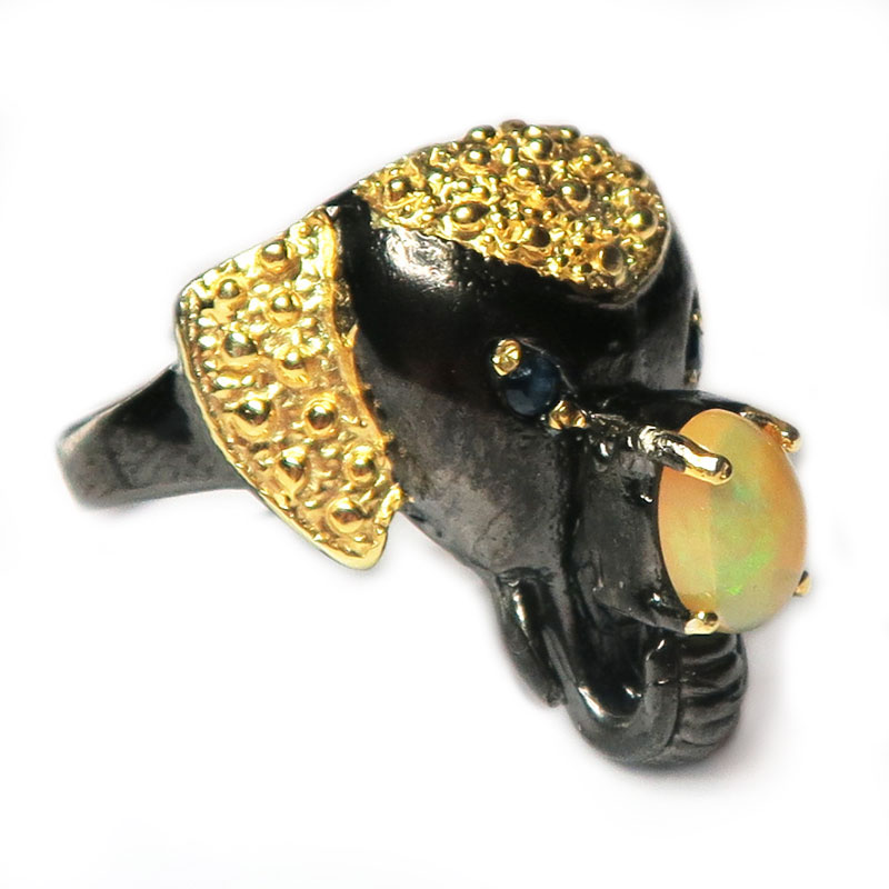 Кольцо "Слон" с натуральными опалами желтого цвета высокого качества с зеленым и красным отблеском, размер кольца 18, размер изделия 2*2.3 см., металл серебро с покрытием черным родием и позолотой, вес кольца 7.38 гр., авторская работа, производство Таиланд.