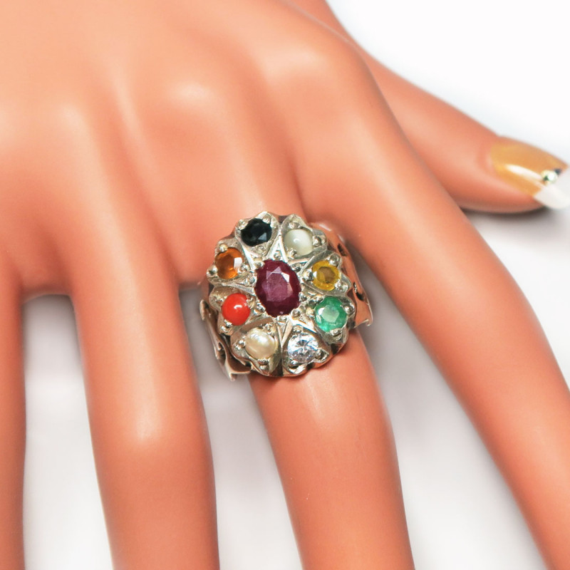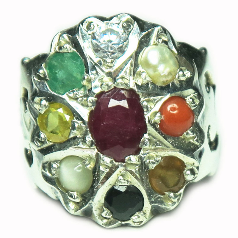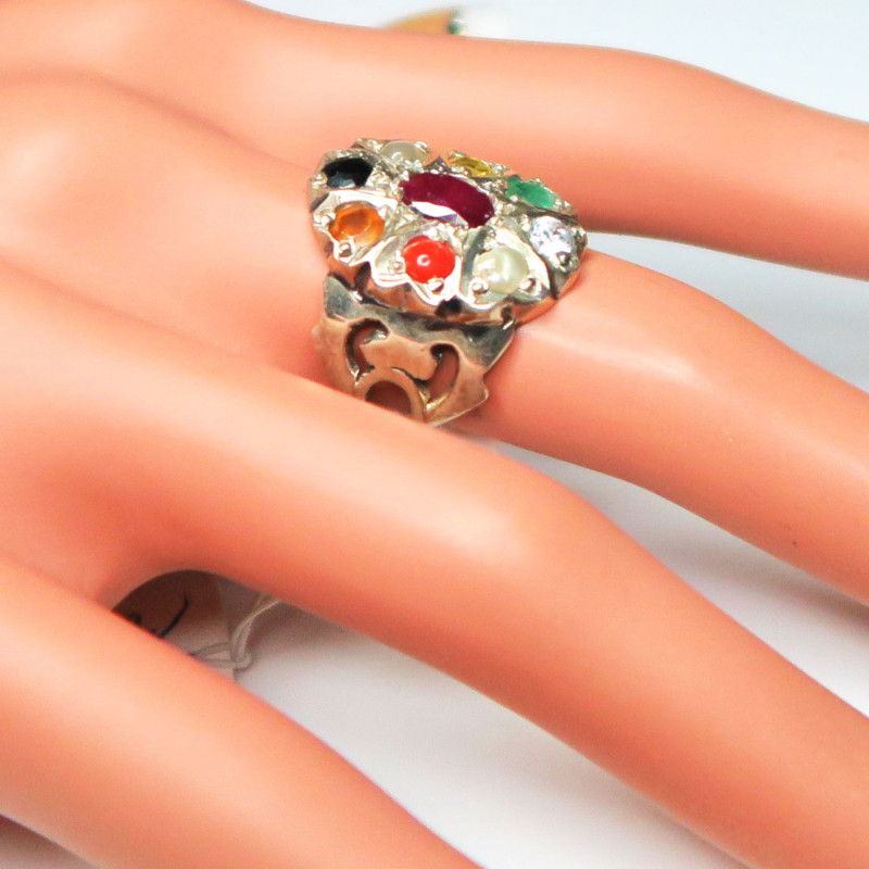 Кольцо с самоцветами: рубином, сердоликом, цитрином, жемчугом, лунным камнем, зеленым бериллом, хрусталем, черной шпинелью, кораллом, размер кольца 18.5, размер изделия 2*1.7 см., серебро, вес кольца 8 гр., производство Индия.