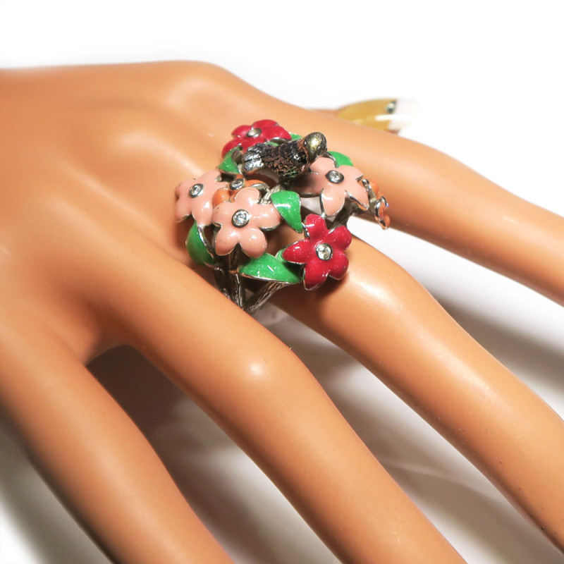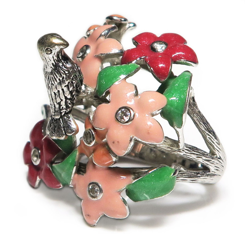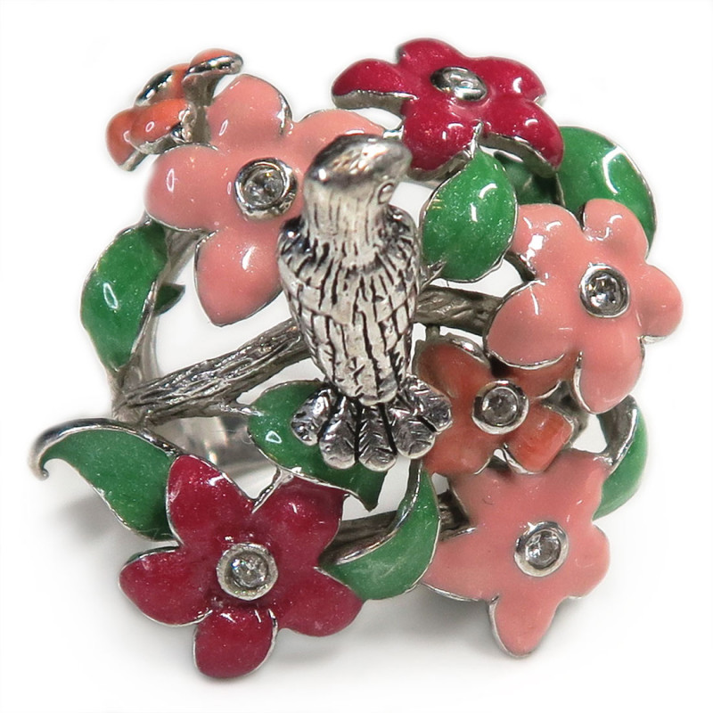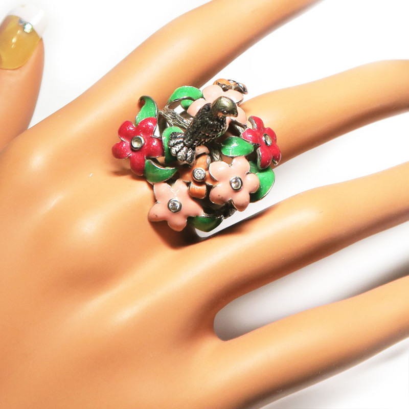 Кольцо с Птичка с цветной эмалью и мелкими фианитами, размер кольца 18.5, размер изделия 3.4*3.1 см. Металл серебро с родиевым покрытием, вес изделия 14.81 гр., производство Таиланд.