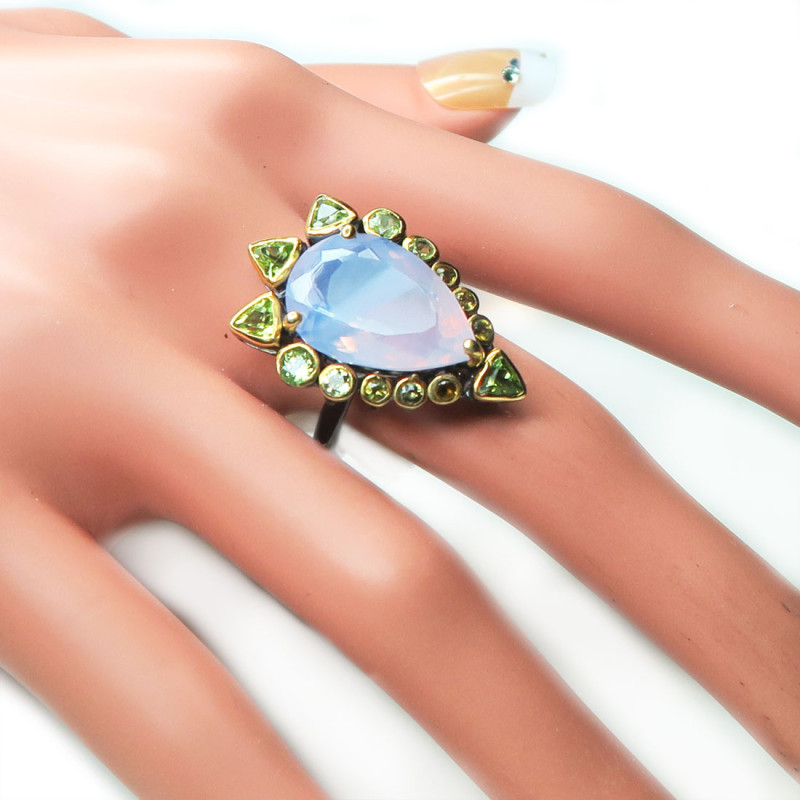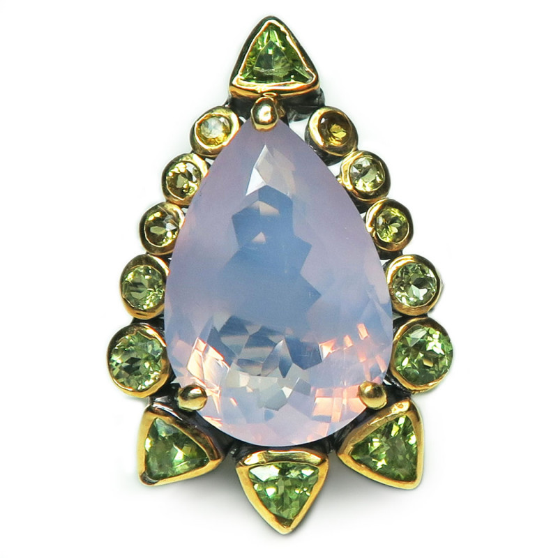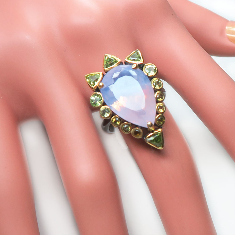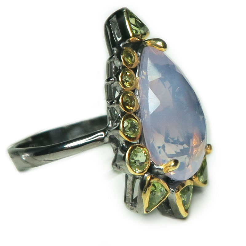 Кольцо с лавандовым аметистом и хризолитом. камни с огранкой. Размер кольца 18.5, размер центрального камня 1.3*1.9 см., размер изделия 3*2 см. Вес изделия 8.84 гр. Металл серебро с родиевым покрытием черного цвета, производство Таиланд.