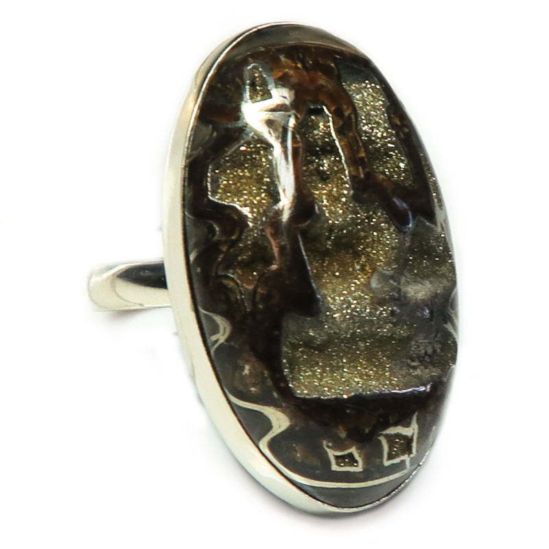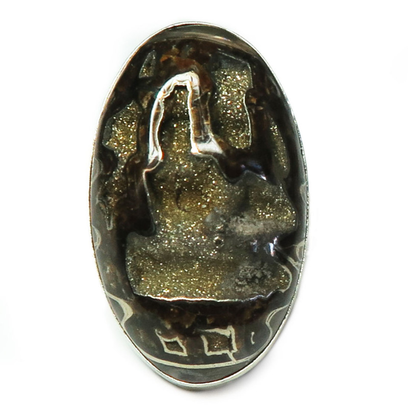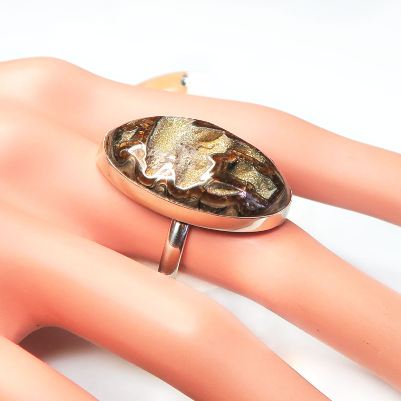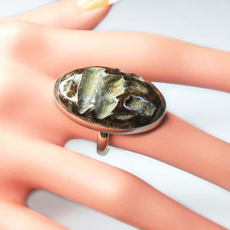 Кольцо с аммонитом в пирите, размер кольца 19, размер камня в кольце 3*1.8 см. Металл нейзильбер, производство Россия.