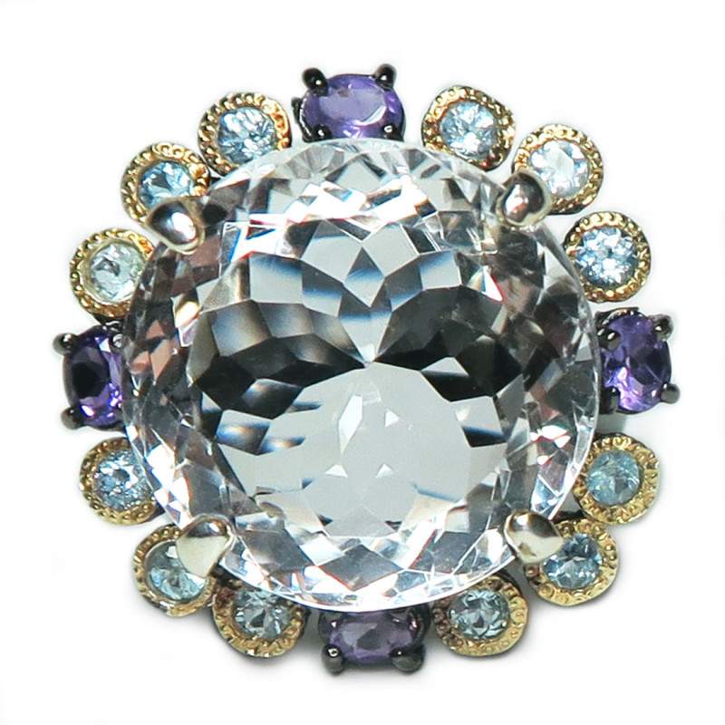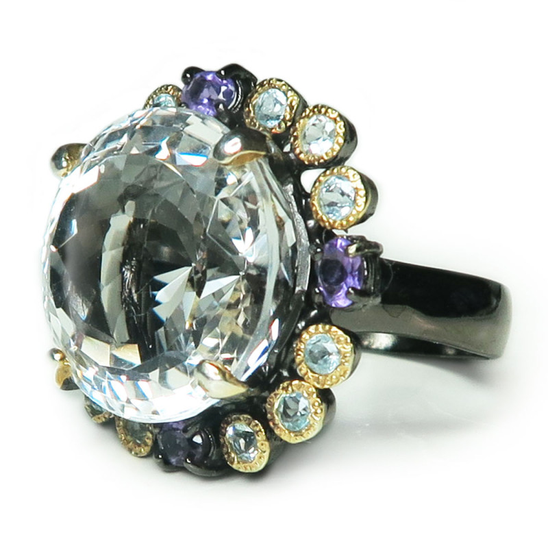 Кольцо с горным хрусталем, голубыми топазами и аметистами, камни с огранкой. Размер кольца 19, размер центрального камня 2 см., размер изделия 2.5 см. Вес изделия 14.23 гр. Металл серебро с родиевым покрытием черного цвета, производство Таиланд.
