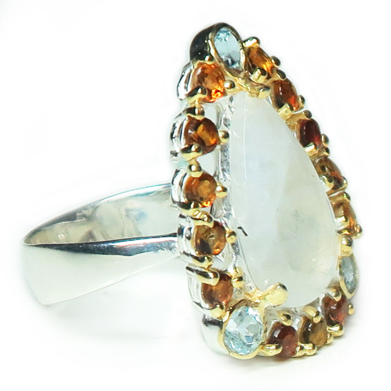 Кольцо с лунным камнем, голубыми топазами, сапфирами коньячного цвета. Размер кольца 17.75, размер изделия 2.5*1.8 см. Вес изделия 6.29 гр. Металл серебро с родиевым покрытием, производство Таиланд.