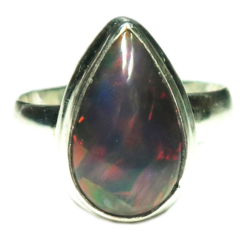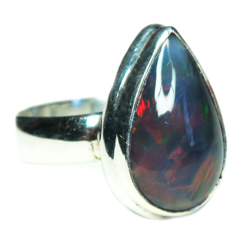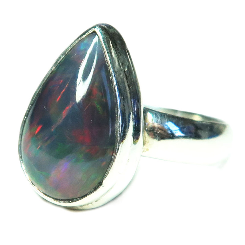 Кольцо с опалом черного цвета, размер кольца 18, камень слегка выпуклый, без огранки, с красным и зеленым отблеском, размер камня в кольце 1.5*0.8 см., вес изделия 4.24 гр., широкая удобная шинка, металл серебро, производство Индия.