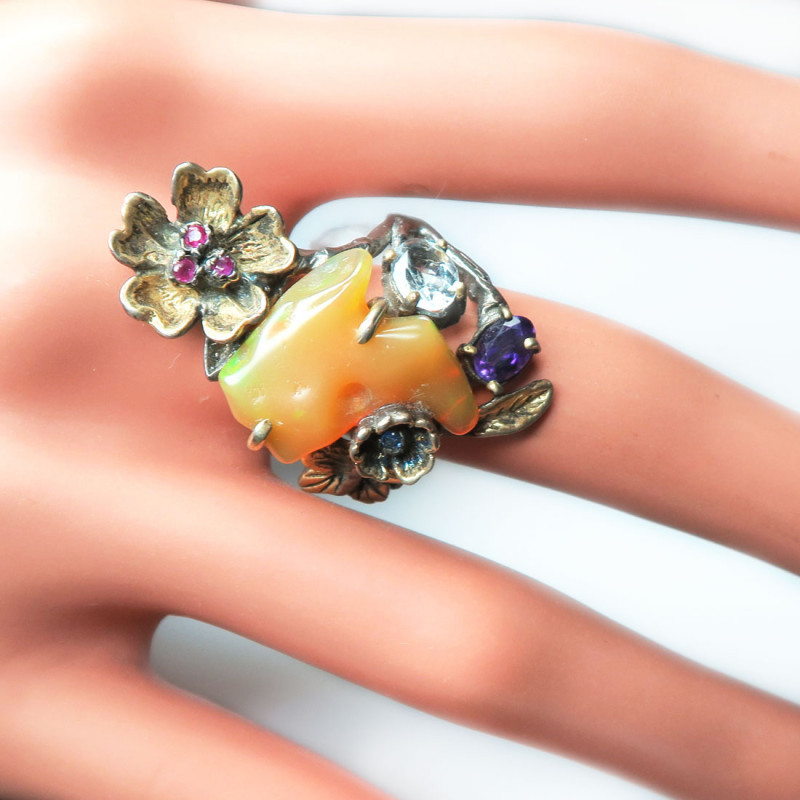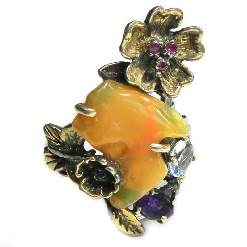 Кольцо с опалом, аметистом, топазом, рубином. Размер кольца 20. Размер камня 2*1.8, размер изделия 3.5*2 см. Металл - серебро с покрытием серым родием и позолотой. Вес кольца 9.08 гр., производство Таиланд.