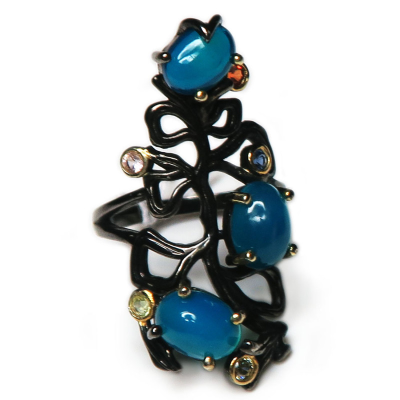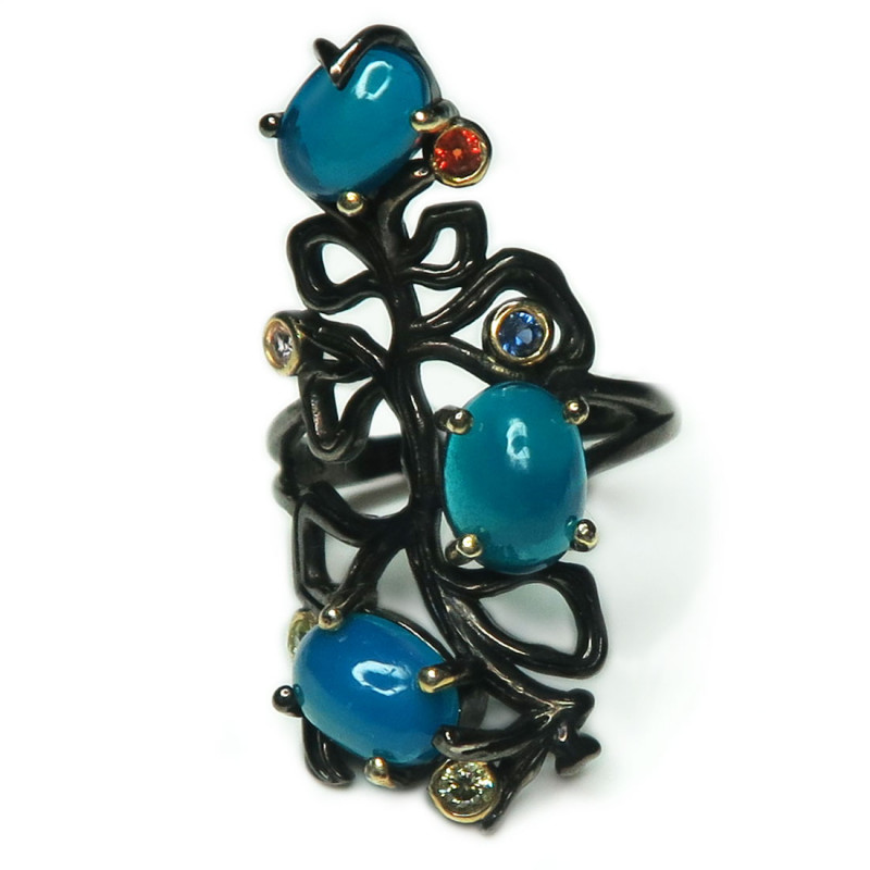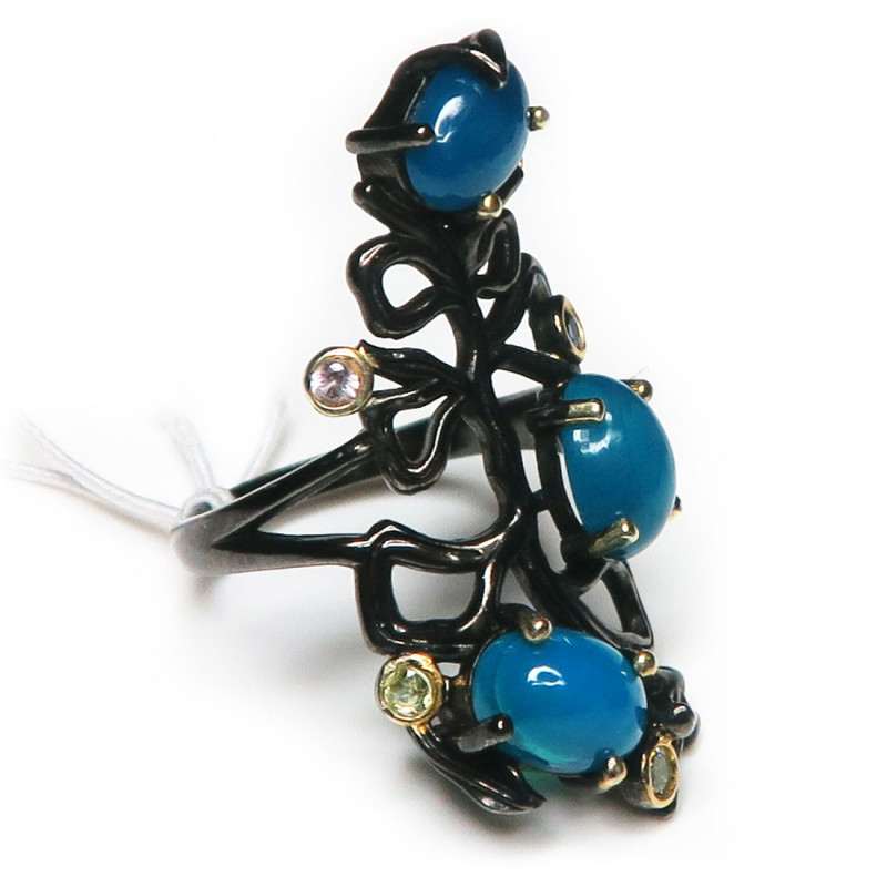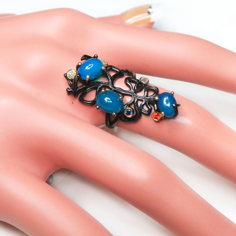 Кольцо с опалом синего цвета и мелкими гранатом, цитрином, сапфиром. Размер кольца 16.5, размер изделия 3*1.5 см., вес кольца 4.92 гр. Металл серебро с покрытием черным родием, производство Таиланд.