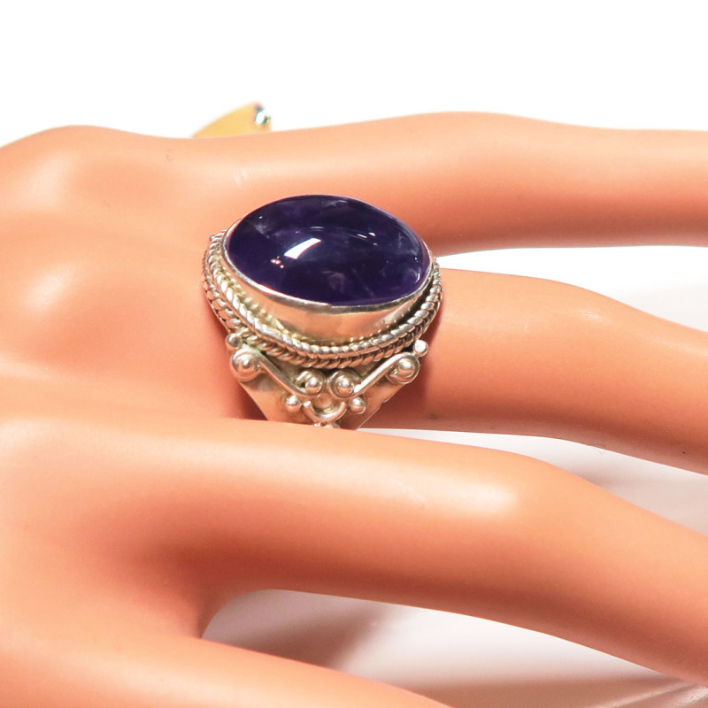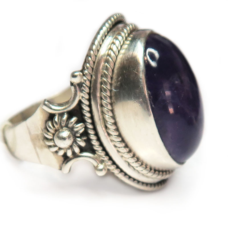Кольцо с аметистом насыщенного цвета, камень без огранки, размер кольца 18, размер камня 1.2*1.6 см., металл серебро, вес кольца 10.5 гр., производство Индия.