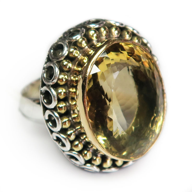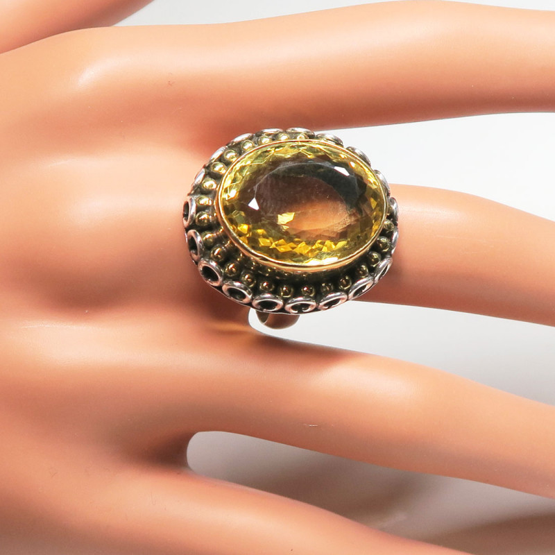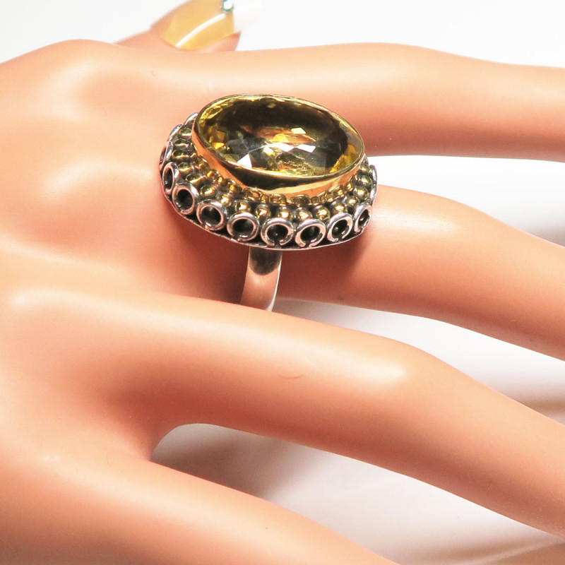 Кольцо с цитрином, камень с огранкой, размер кольца 18, размер камня в кольце 1.5*2 см., размер изделия 2.5*2.2 см., вес изделия 12.9 гр., серебро с позолотой, производство Индия.