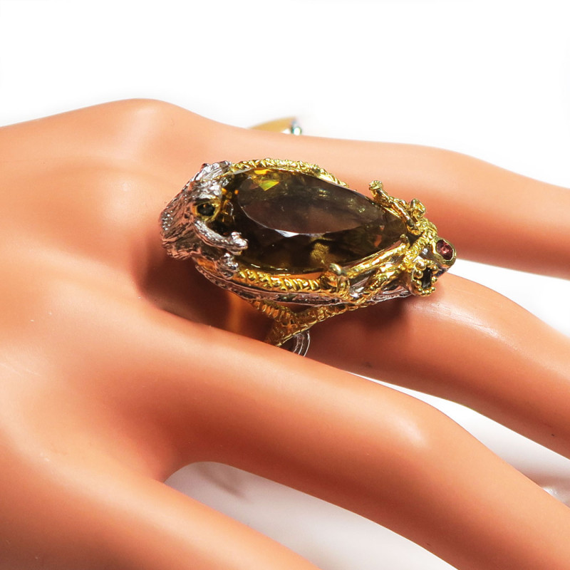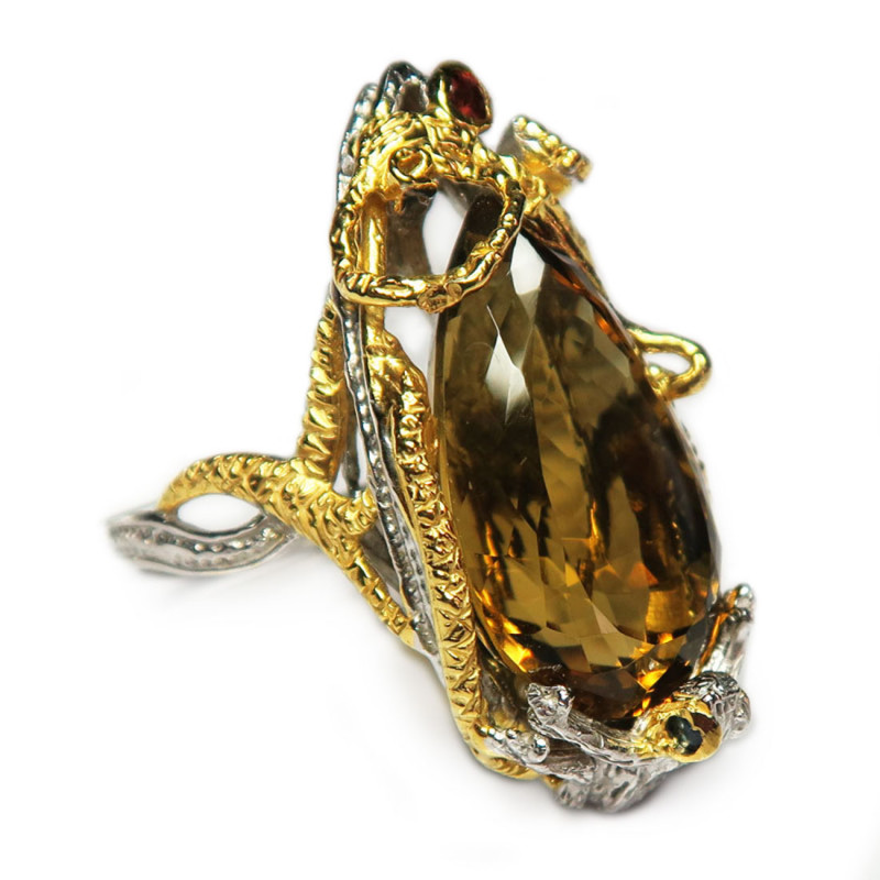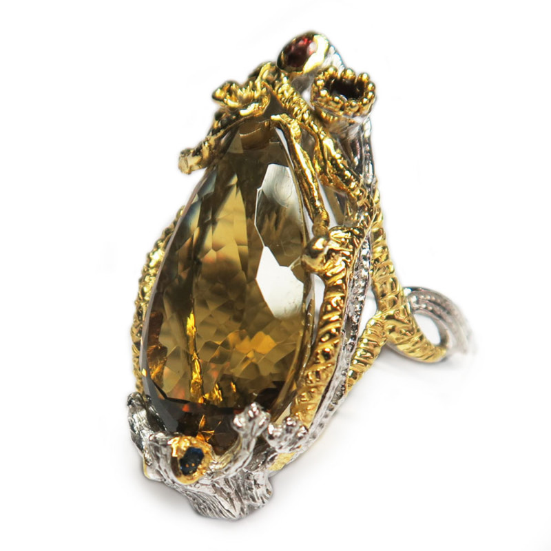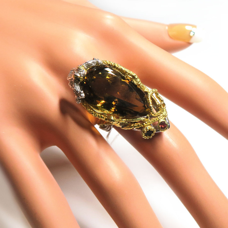Кольцо с цитрином и мелким гранатом и раухтопазом, огранка, размер кольца 18.5, размер камня 2.5*1.5 см., вес кольца 13.39 гр., камень хорошего качества, серебро с покрытием родия и позолотой, авторское изделие, производство Таиланд.