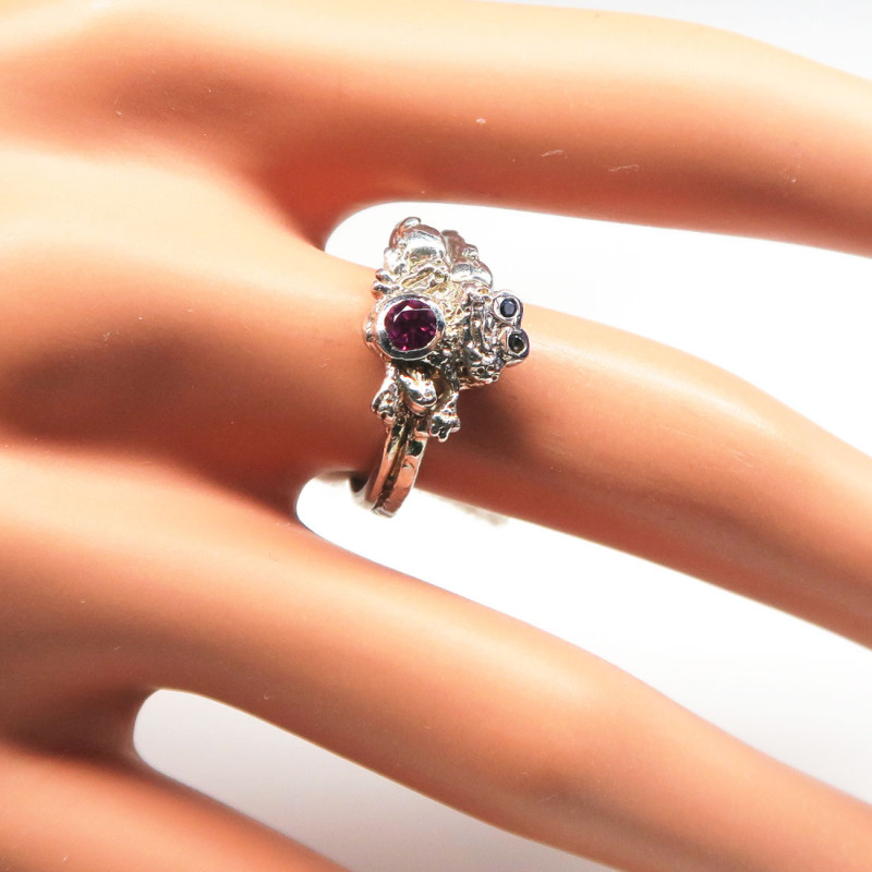 Кольцо с гранатом родолитом, камень с огранкой, размер кольца 18, размер изделия 1.2*1.3 см., размер камня 0.4 см., вес кольца 4 гр., серебро с позолотой, производство Таиланд.