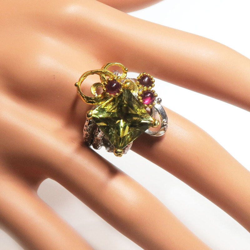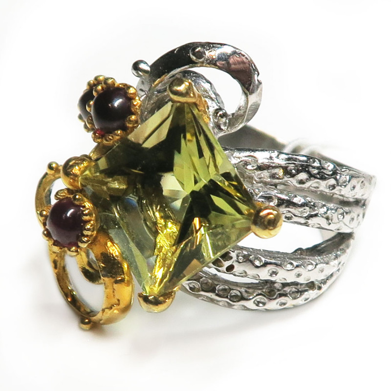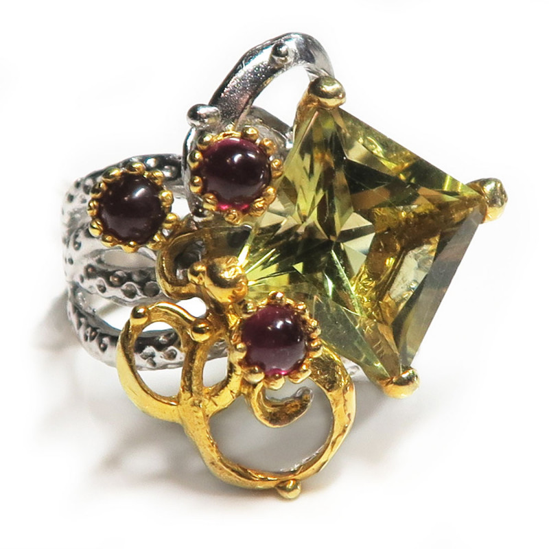 Кольцо с лимонным цитрином с огранкой и мелким гранатом без огранки, размер кольца 18, размер камня 1.2*1.2 см., размер изделия 2.5*2.3 см., вес кольца 11 гр., камень хорошего качества, серебро с покрытием родия и позолотой, авторское изделие, производство Таиланд.