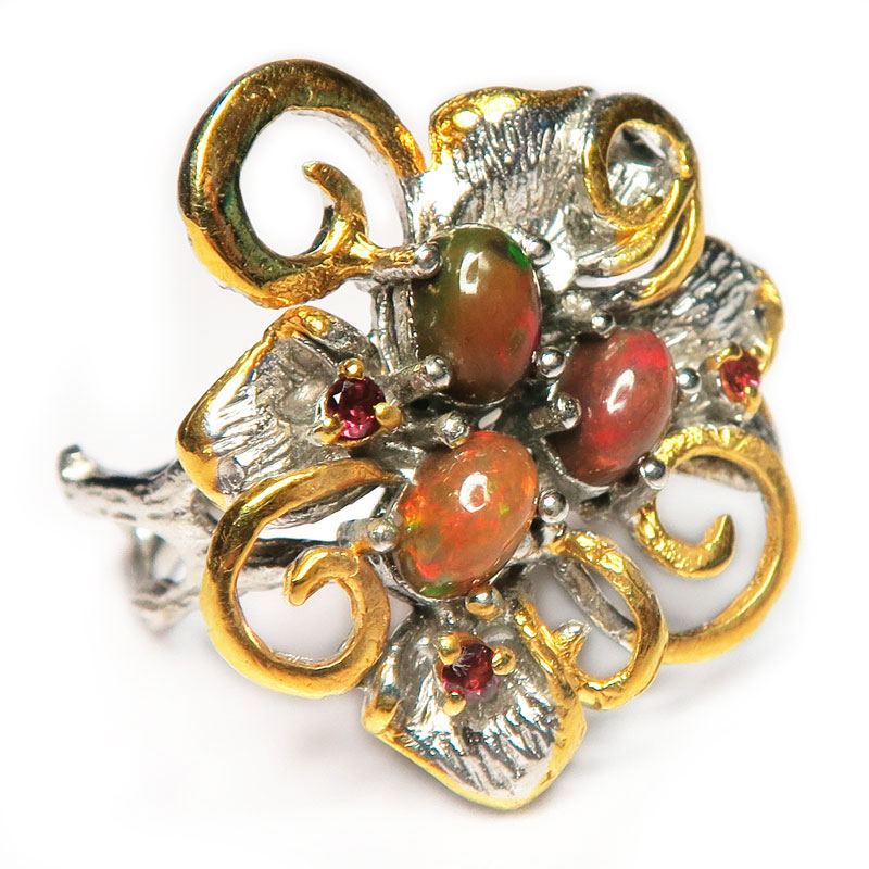 Кольцо с опалом коричневого цвета с огранкой и мелким гранатом, размер кольца 18, размер камня 0.4*0.7 см., размер изделия 2.3*2.7 см., серебро с покрытием серого родия и позолотой, вес кольца 7.5 гр., авторское изделие, производство Таиланд.