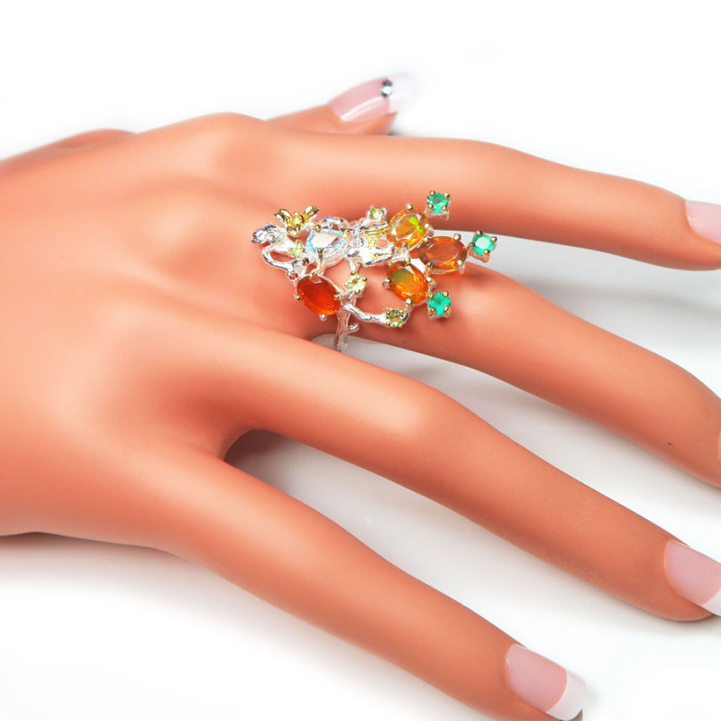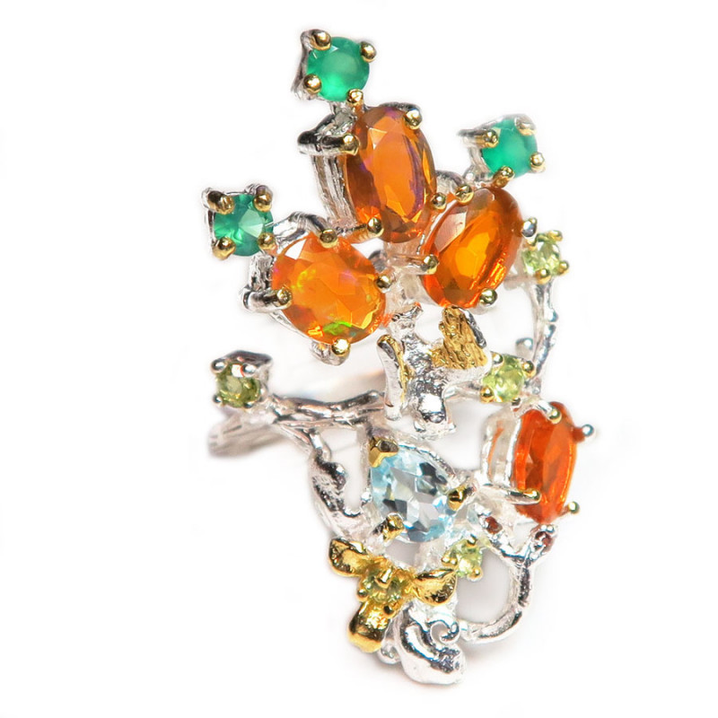 Кольцо с натуральным опалом оранжевого цвета, голубым топазом, хризолитом, зеленым ониксом, размер кольца 17.5, размер изделия 3.7*2.2 см., металл серебро с позолотой, вес кольца 6.8 гр., производство Таиланд.