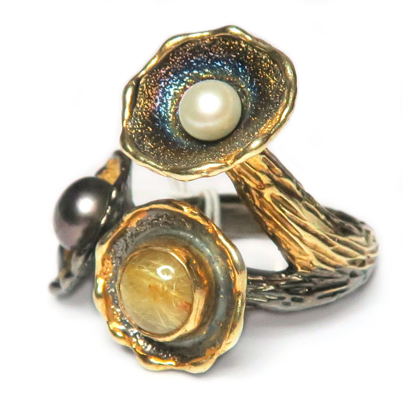 Кольцо белым, черным жемчугом и рутиловым кварцем, серебро с чернением и позолотой, размер кольца 17, размер изделия 2.8*2.6 см., вес кольца 11.3 гр., авторская работа, производство Тайланд.