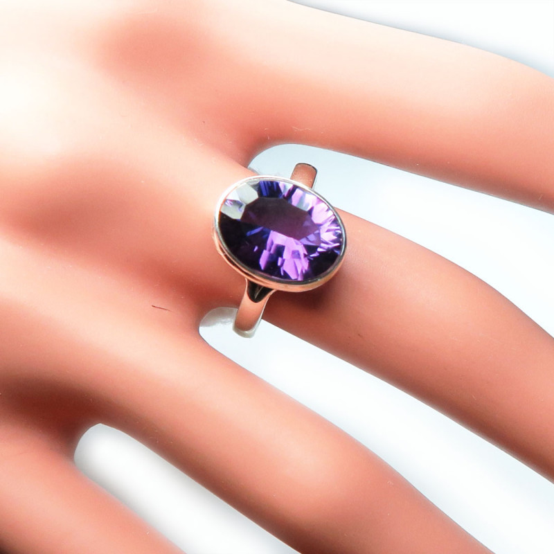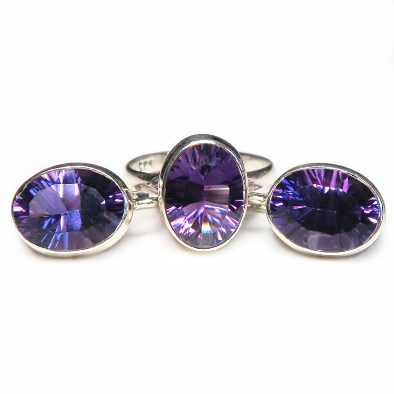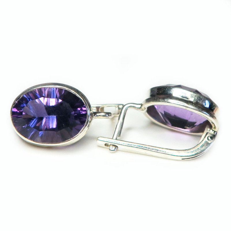 Комплект с аметистом, камни с лазерной огранкой хорошего качества, размер кольца 18.5, размер камня 1.4*1 см., в серьгах английский замок, металл серебро, вес комплекта 8.97 гр., производство Индия.