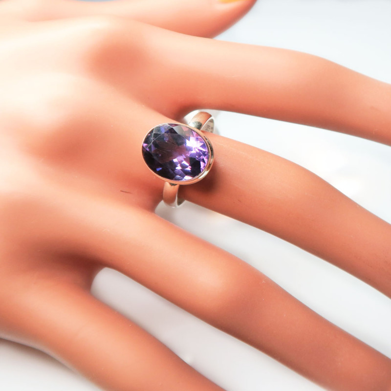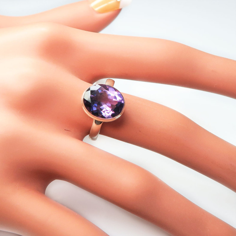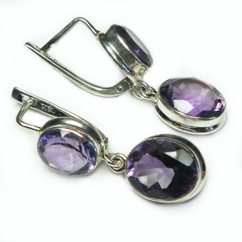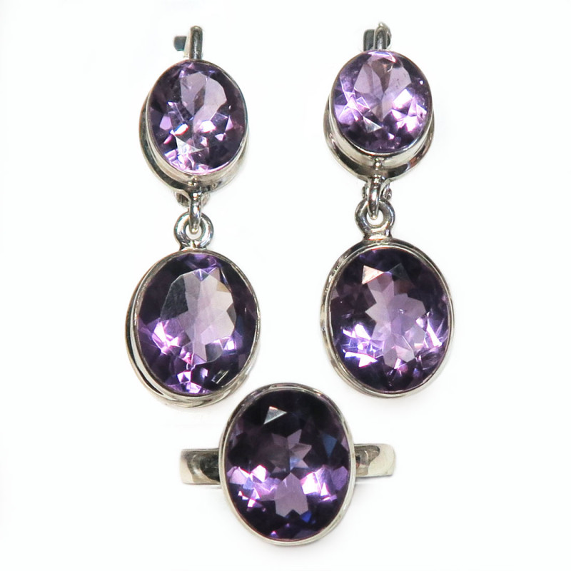 Комплект с аметистом, камни с огранкой хорошего качества, размер кольца 18.5, 19, размер нижнего камня 1.2*1, размер верхнего камня 1*0.8 см., в серьгах английский замок, металл серебро, вес комплекта 10.94-11 гр., производство Индия.