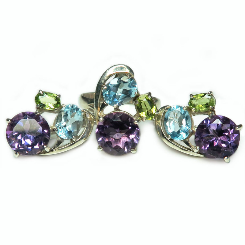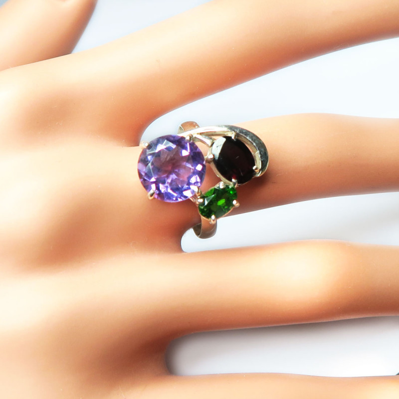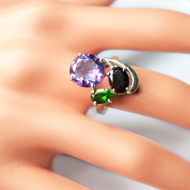 Комплект с аметистом, гранатом и хромдиопсидом. Размер кольца 18.5, размер камней 1*1, 0.9*0.6, 0.8*0.4 см., размер изделия 2.2*5 см. Металл серебро, вес комплекта 11.7 гр., производство Индия.
