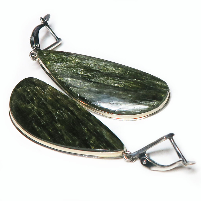 Комплект с эпидотом, размер кольца 18. Камни полупрозрачные хорошего качества. Размер камня в кольце 3.5*1.7, размер камня в серьгах 4*1.8 см. В серьгах английский замок. Металл нейзильбер, производство Россия. Камень с красивым переливом. Размер кольца можно отрегулировать в любую сторону.