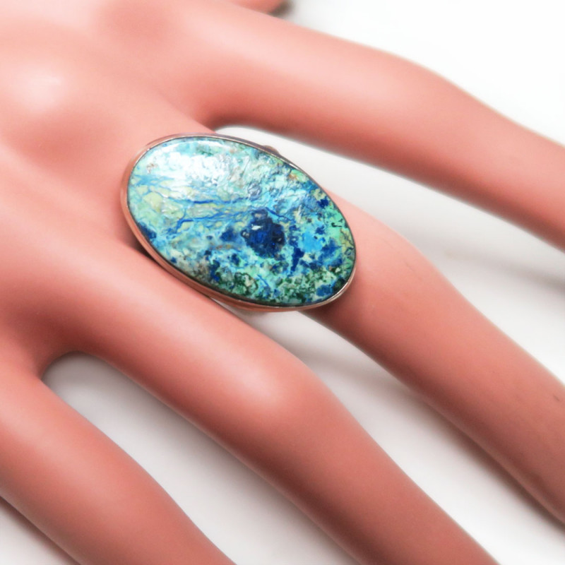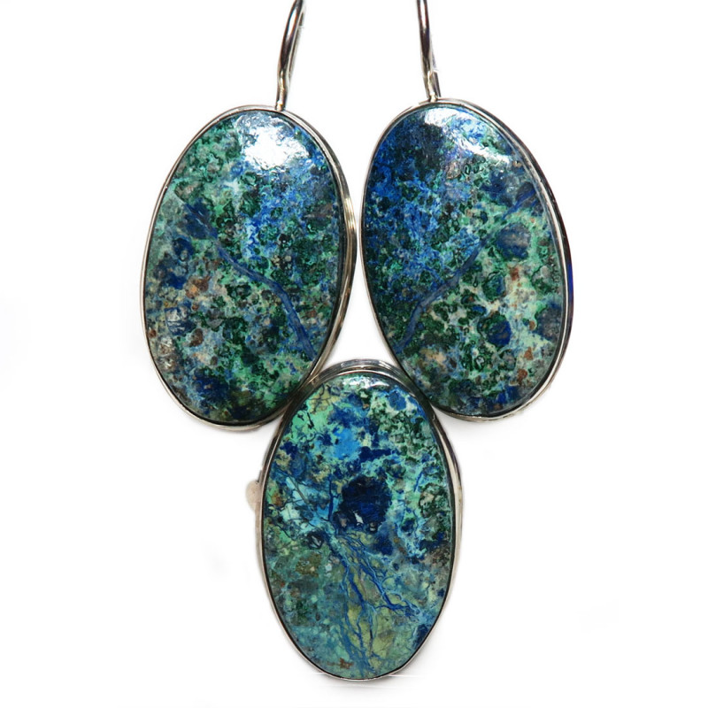 Комплект с хризоколлой с включениями малахита. Размер кольца 18, размер камня в комплекте 2.8*1.8 см., в серьгах замок петля длинная, металл нейзильбер, размер кольца можно немного отрегулировать, производство Россия.