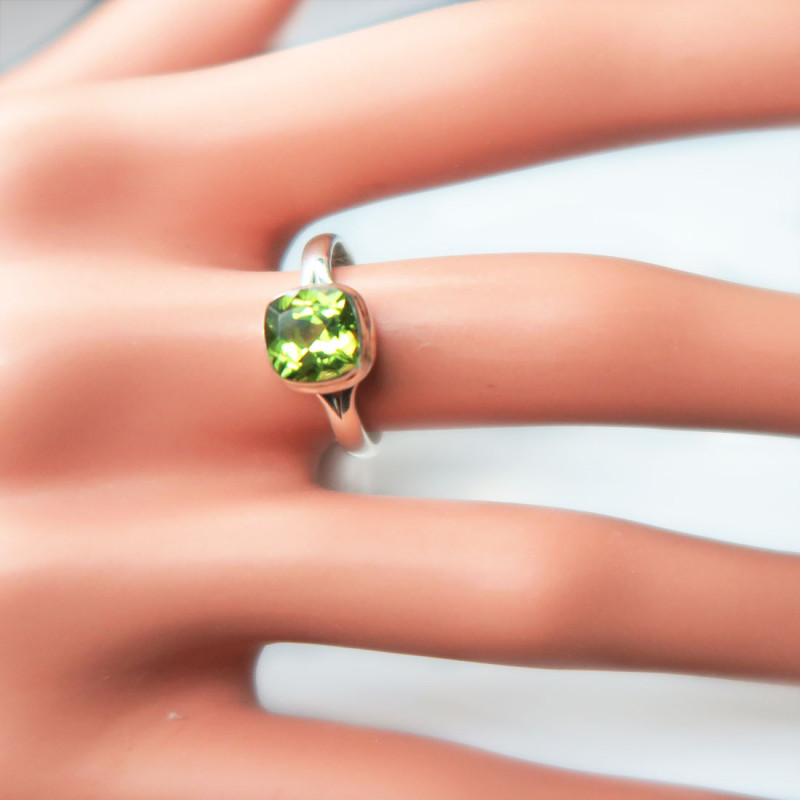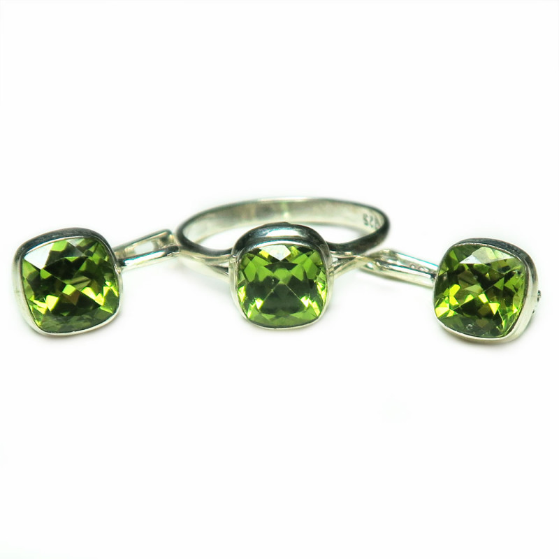 Комплект с хризолитом (оливином) отличного качества, камни с огранкой, размер кольца 18, размер камня 0.7*0.7 см., в серьгах английский замок, вес комплекта 5.64 гр., металл серебро, производство Индия.