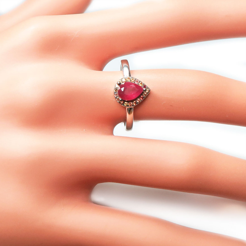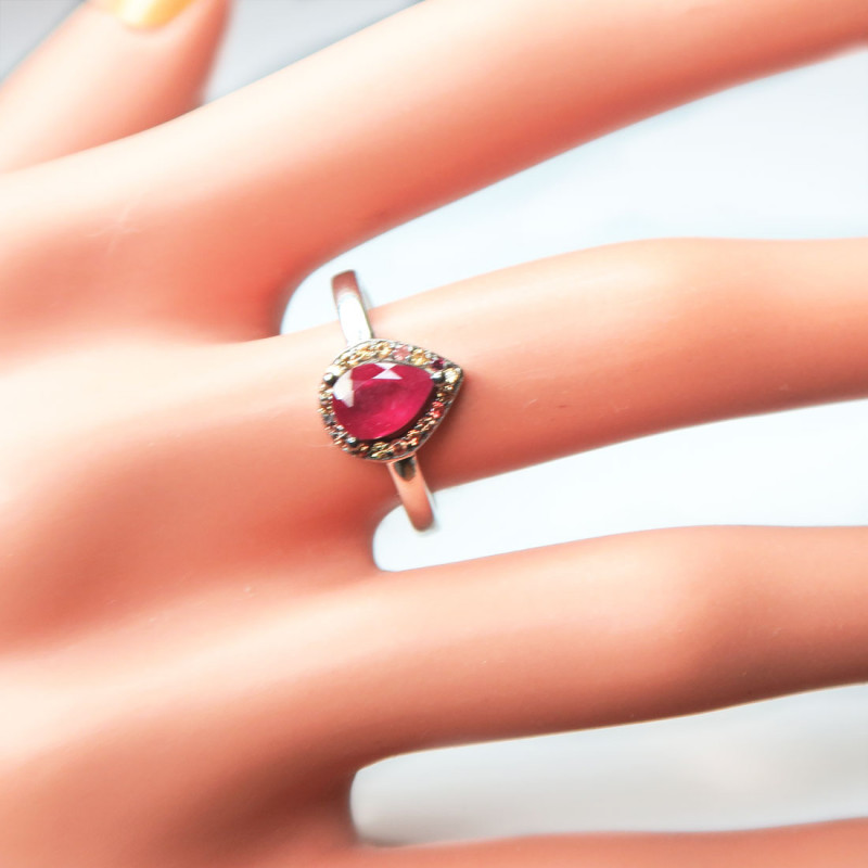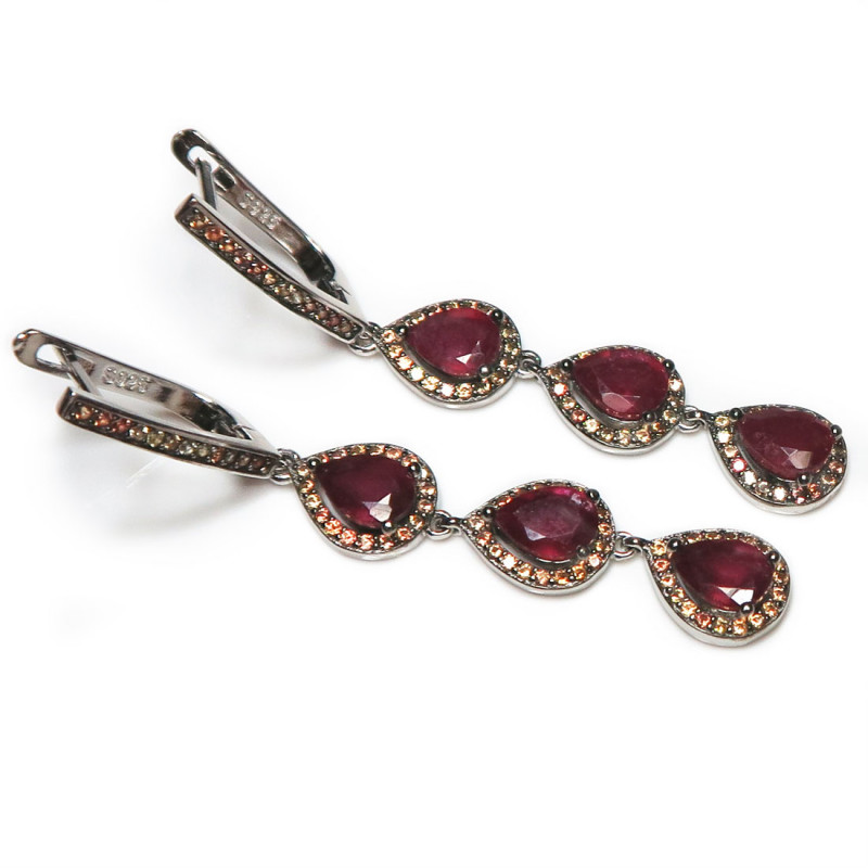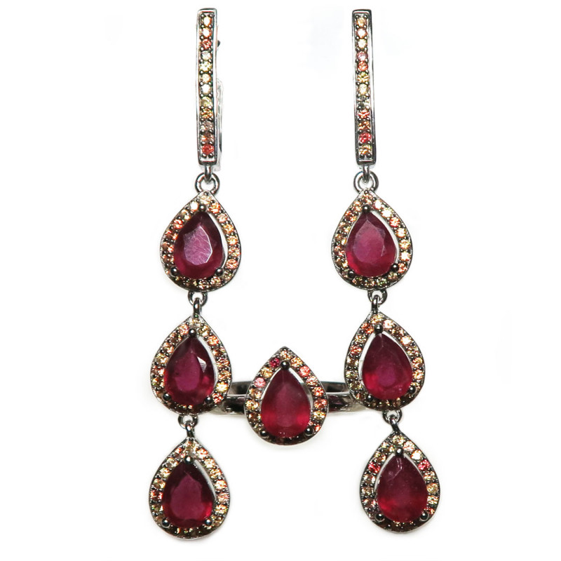 Комплект с рубинами в обрамлении желтых сапфиров падпараджа, размер кольца 17.5-17.75, размер изделия в кольце 10*9 мм., вес комплекта 9.31 гр. Размер рубинов 5*7 мм. Камни с хорошей прозрачностью. Длина серьги 3.8 см., без учета замка. Металл серебро с родиевым покрытием, производство Таиланд.